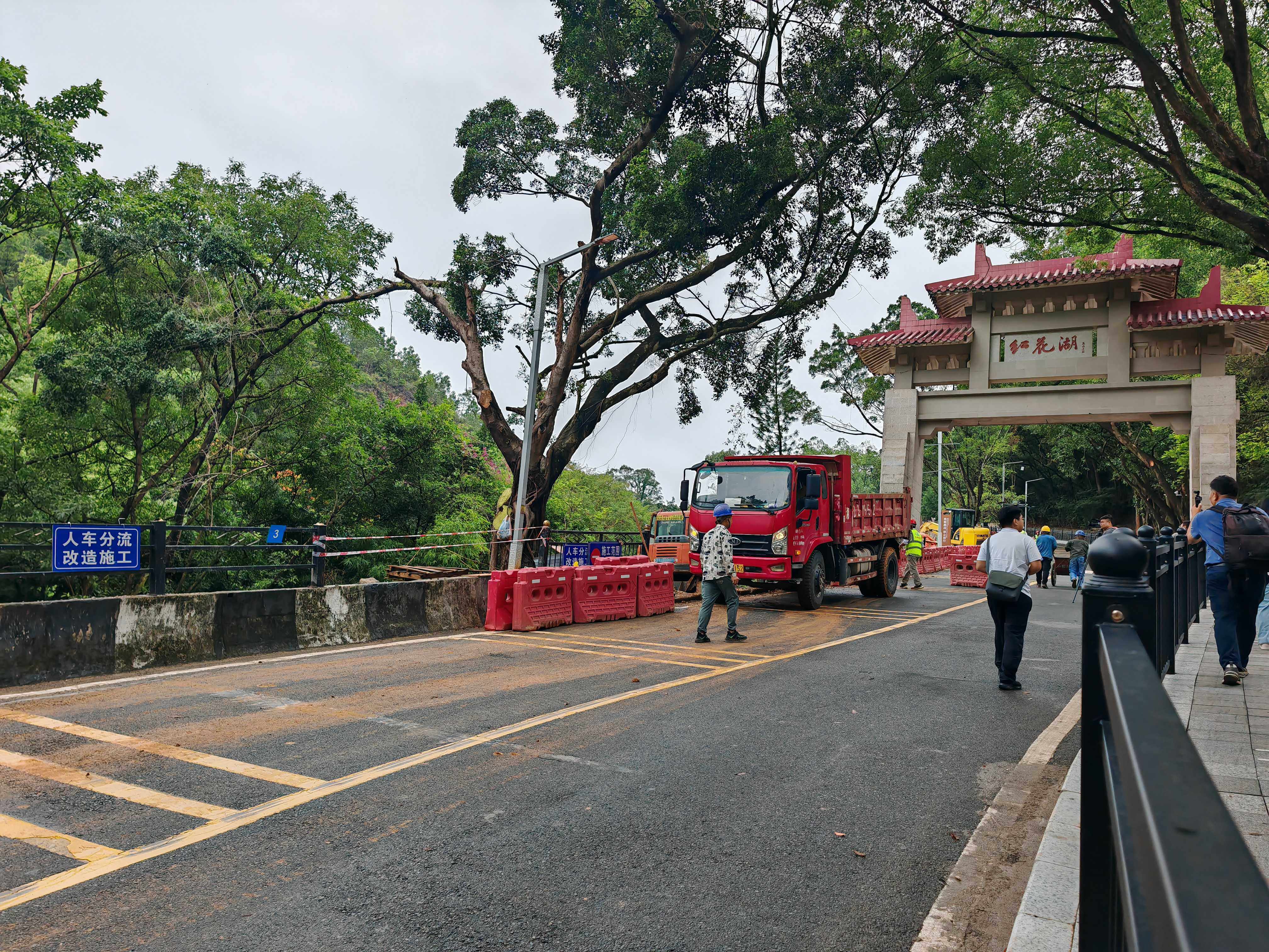 紅花湖景區(qū)東入口上坡路段人車分流提升改造工程目前正在緊張施工中。