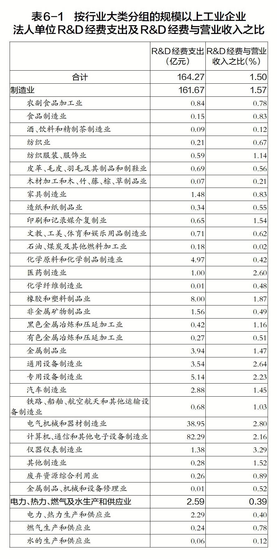 2023年,規(guī)模以上工業(yè)企業(yè)法人單位R&D經(jīng)費(fèi)支出164.27億元,比2018年增長83.9%;R&D經(jīng)費(fèi)與營業(yè)收入之比為1.5%。規(guī)模以上工業(yè)企業(yè)法人單位分行業(yè)R&D經(jīng)費(fèi)支出及R&D經(jīng)費(fèi)與營業(yè)收入之比詳見表6-1。
