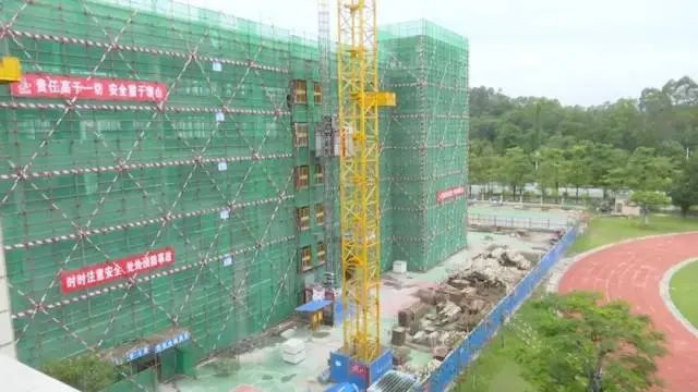 在惠州市第一中學(xué)江北校區(qū)項(xiàng)目建設(shè)現(xiàn)場,一側(cè)的教學(xué)樓搭滿了腳手架,將建筑層層包裹,工人們穿梭其間,為教學(xué)樓外觀與功能升級全力奮戰(zhàn)。