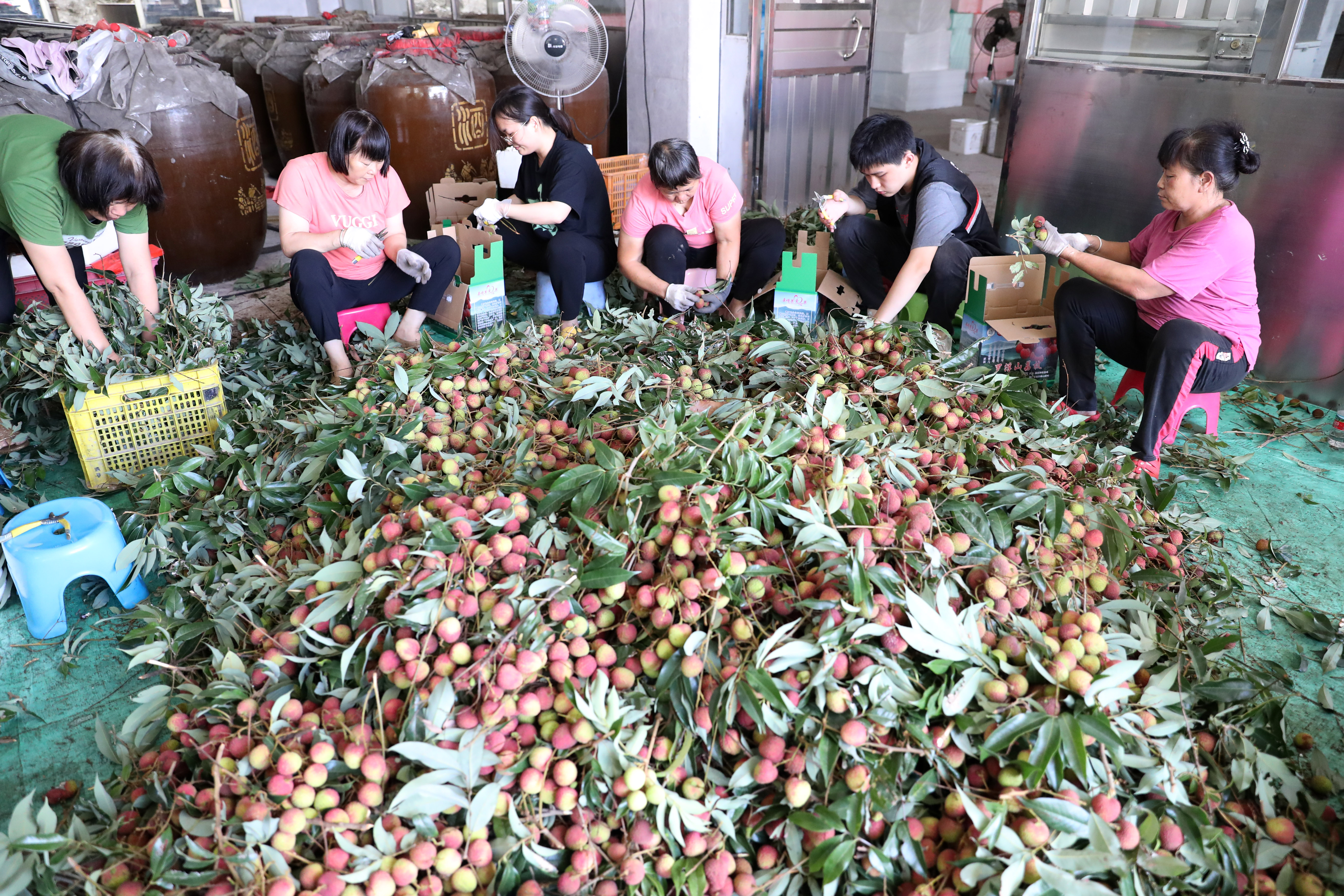 博羅縣龍華鎮(zhèn)山前村果農(nóng)忙著給采收回來的荔枝修剪及打包。