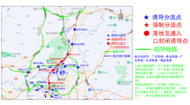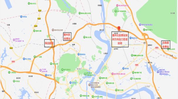上述交通管制路段沿線收費(fèi)站及立交同步實(shí)施四角樓、惠州北、惠州西收費(fèi)站進(jìn)出口全封閉,禁止車輛通行;廣惠高速小金口收費(fèi)站往長(zhǎng)深高速匝道封閉,禁止車輛通行;廣惠高速小金口立交處,廣惠高速?gòu)V州往小金口立交出口及往長(zhǎng)深高速河源、深圳方向匝道封閉,禁止車輛通行;象頭山立交處,惠龍高速往長(zhǎng)深高速深圳方向匝道封閉,禁止車輛通行;珠田樞紐處,廣龍高速往長(zhǎng)深高速河源方向匝道封閉,禁止車輛通行交通管制措施。