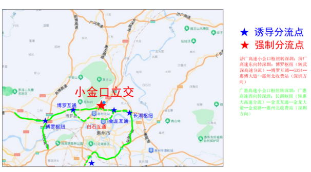 廣惠高速小金口立交轉(zhuǎn)長(zhǎng)深高速深圳方向匝道交通管制時(shí)間為7月3日10:00-8月31日10:00,廣惠高速小金口立交轉(zhuǎn)長(zhǎng)深高速深圳方向匝道臨時(shí)封閉,禁止車輛通行。廣惠高速小金口立交轉(zhuǎn)長(zhǎng)深高速深圳方向的車輛,請(qǐng)?zhí)崆霸趶V惠高速小金口收費(fèi)站下高速繞行長(zhǎng)深高速四角樓或惠州北收費(fèi)站通行;若行駛過小金口收費(fèi)站的車輛可到四角樓收費(fèi)站下高速再上高速往深圳方向通行。