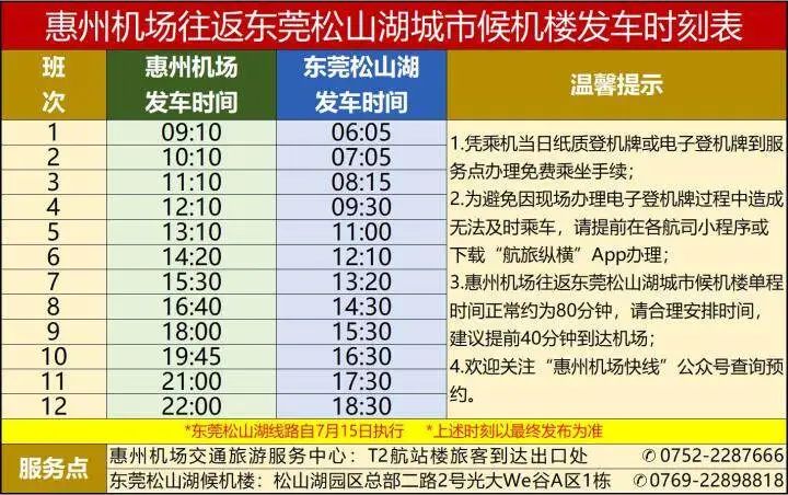 乘機(jī)當(dāng)日,旅客憑紙質(zhì)或電子登機(jī)牌在惠州機(jī)場(chǎng)交通旅游服務(wù)中心(招呼站)及深圳龍崗、東莞松山湖城市候機(jī)樓辦理乘車手續(xù)后,即可免費(fèi)乘坐線路車輛。深圳龍崗、東莞松山湖線路每日各安排24班次往返惠州機(jī)場(chǎng),發(fā)車密度滿足旅客需求。