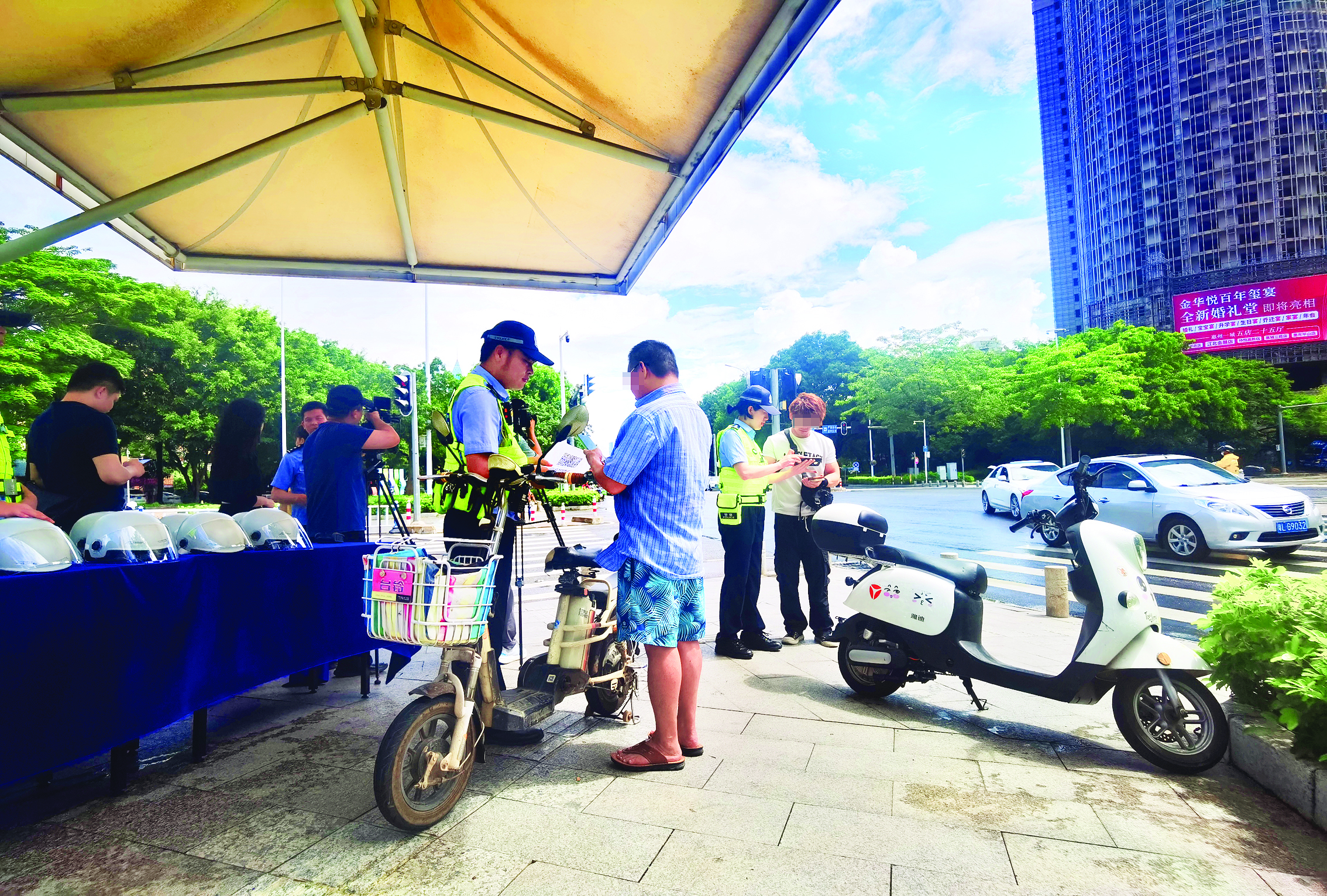 惠州交警對(duì)駕乘電動(dòng)自行車(chē)未規(guī)范佩戴安全頭盔、未按道行駛等交通違法行為進(jìn)行處罰;葜萑?qǐng)?bào)記者劉豪偉 攝