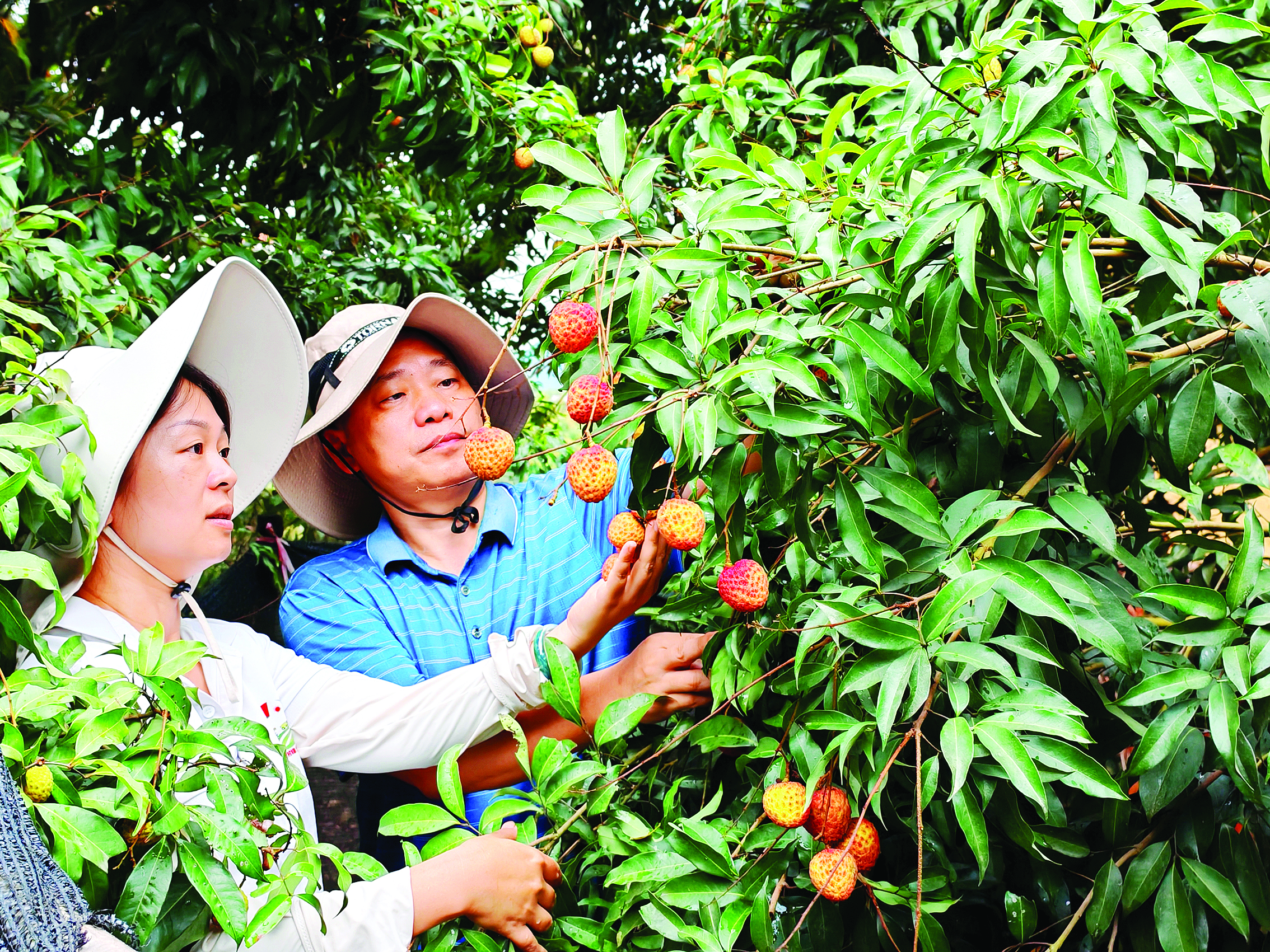 專家和農(nóng)技人員查看荔枝生長情況;葜萑請笥浾哧惔夯 攝