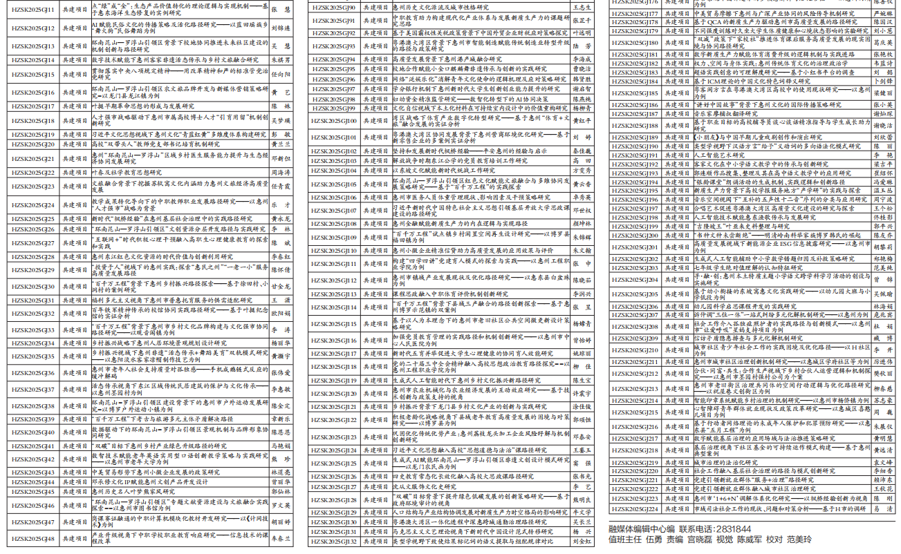 根據(jù)《惠州市哲學社會科學規(guī)劃項目管理制度》及《關于申報2025年度惠州市哲學社會科學規(guī)劃項目的通告》要求,經(jīng)過嚴格的專家評審組評議、市社科聯(lián)黨組審議等程序,評出2025年度惠州市哲學社會科學規(guī)劃立項項目254項,其中重點項目30項,共建項目224項。現(xiàn)將立項名單予以公布。