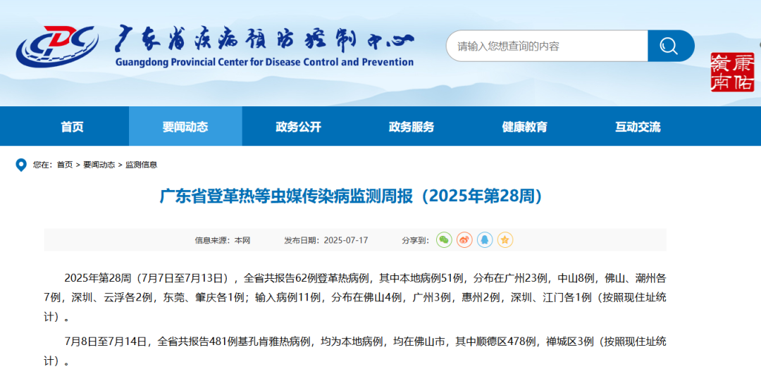 據(jù)廣東省疾病預(yù)防控制中心網(wǎng)站發(fā)布廣東省登革熱等蟲媒傳染病監(jiān)測周報(2025年第28周)顯示,2025年第28周(7月7日至7月13日),全省共報告62例登革熱病例,其中本地病例51例,分布在廣州23例,中山8例,佛山、潮州各7例,深圳、云浮各2例,東莞、肇慶各1例;輸入病例11例,分布在佛山4例,廣州3例,惠州2例,深圳、江門各1例(按照現(xiàn)住址統(tǒng)計)。