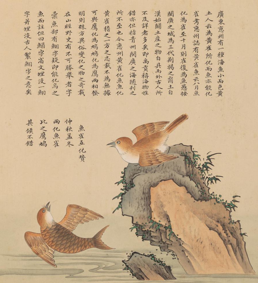 《海錯(cuò)圖》記載了不少與惠州有關(guān)的物種故事,如書中一篇《雀魚互化》寫道:“廣東惠州有一種海魚,小而色黃,土人云為黃雀所化,而魚亦能化雀,考《惠州志》有黃雀魚,云八月魚化為雀,至十月則雀復(fù)為魚。”聶璜感慨,福建、廣東一帶有很多土特產(chǎn),古人都不曾詳細(xì)記載過(guò),如《尚書·禹貢》描述的“海物惟錯(cuò)”,就沒(méi)有將福建、廣東沿海土特產(chǎn)囊括進(jìn)去!敖窕葜蔹S雀化魚、魚化黃雀,稽之一方之志載,不為無(wú)據(jù),可與鷹化為鳩、鳩化為鷹兩相發(fā)明,則殊方異俗,變化之物之奇,載在山經(jīng)野史,有不可勝舉者。”聶璜還寫詩(shī)《魚雀互化贊》云:“仲秋孟冬,兩化魚雀。比之鷹鳩,其候不錯(cuò)!