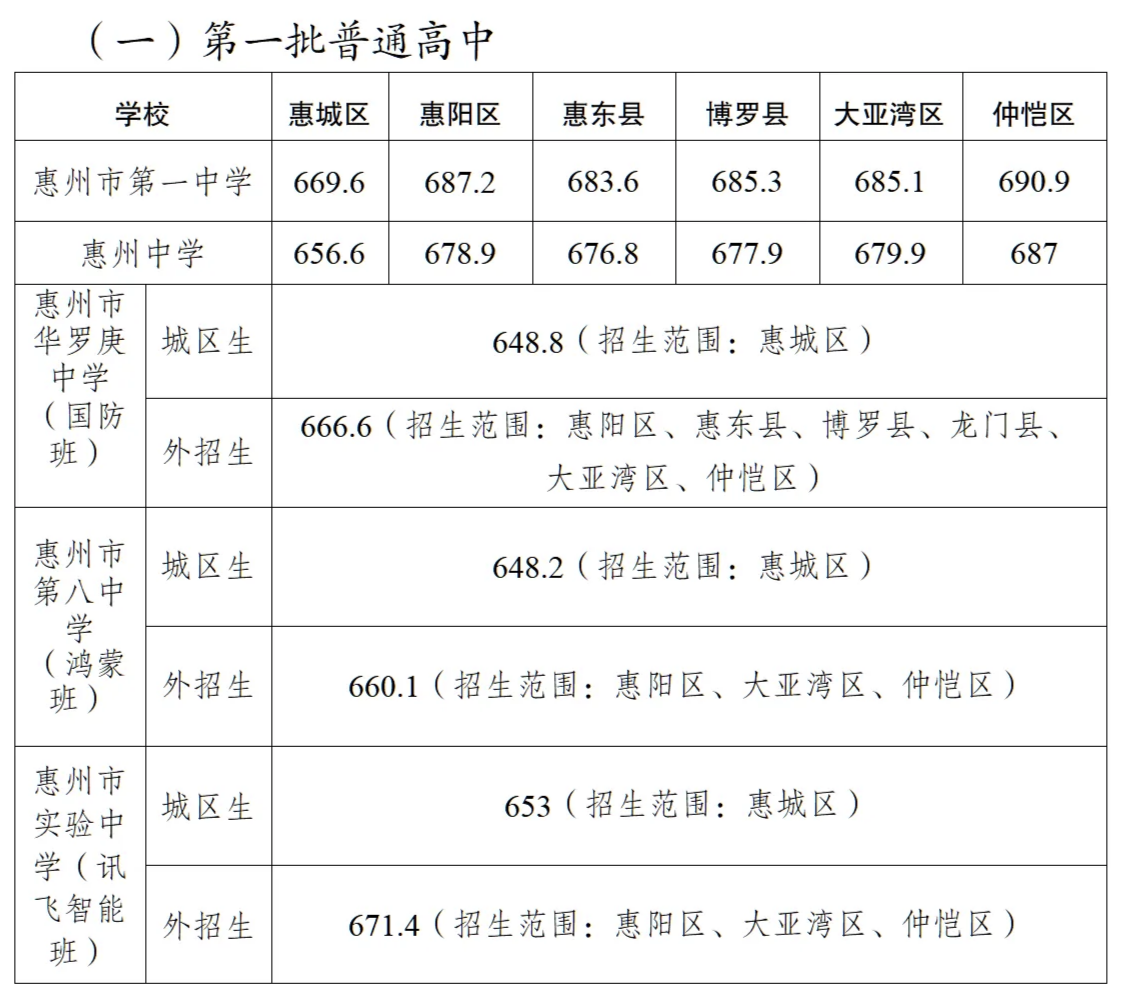 第一批普通高中里,惠州市第一中學(xué)錄取分?jǐn)?shù)線為:惠城區(qū)669.6分、惠陽(yáng)區(qū)687.2分、惠東縣683.6分、博羅縣685.3分、大亞灣區(qū)685.1分、仲愷高新區(qū)690.9分;葜葜袑W(xué)錄取分?jǐn)?shù)線為:惠城區(qū)656.6分、惠陽(yáng)區(qū)678.9分、惠東縣676.8分、博羅縣677.9分、大亞灣區(qū)679.9分、仲愷高新區(qū)687分;葜菔腥A羅庚中學(xué)城區(qū)生錄取分?jǐn)?shù)線為648.8分,惠州市華羅庚中學(xué)外招生錄取分?jǐn)?shù)線為666.6分。
