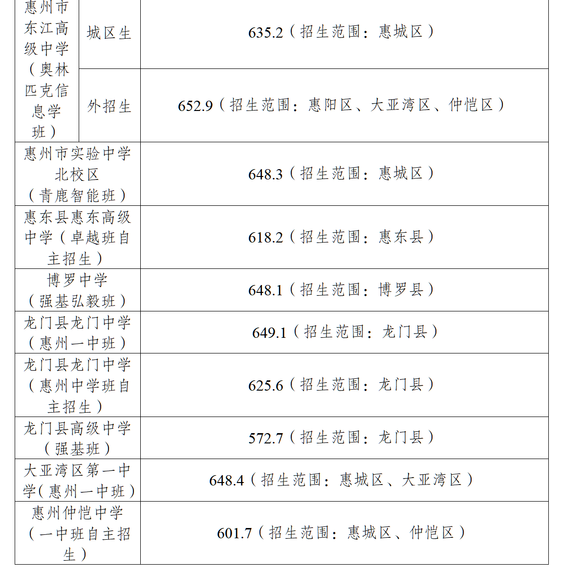 惠州市第八中學(xué)(鴻蒙班)城區(qū)生648.2分、外招生660.1分;惠州市實(shí)驗(yàn)中學(xué)(訊飛智能班)城區(qū)生653分、外招生671.4分;惠州市東江高級(jí)中學(xué)(奧林匹克信息學(xué)班)城區(qū)生635.2分、外招生652.9分;惠州市實(shí)驗(yàn)中學(xué)北校區(qū)(青鹿智能班)648.3分。