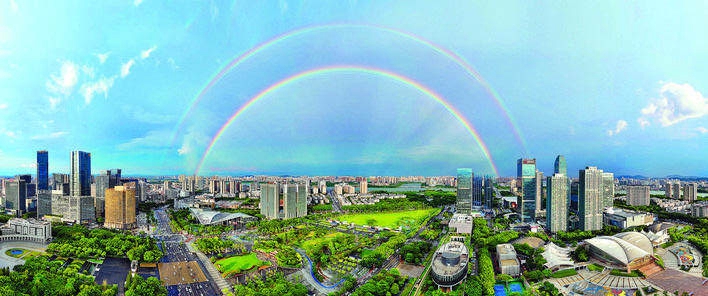 7月25日傍晚時分,驟雨過后,兩道“彩虹橋”橫跨惠州市區(qū)上空。雙彩虹、天空、高樓大廈交相輝映,美不勝收,市民紛紛拿出手機、相機拍照發(fā)朋友圈分享。