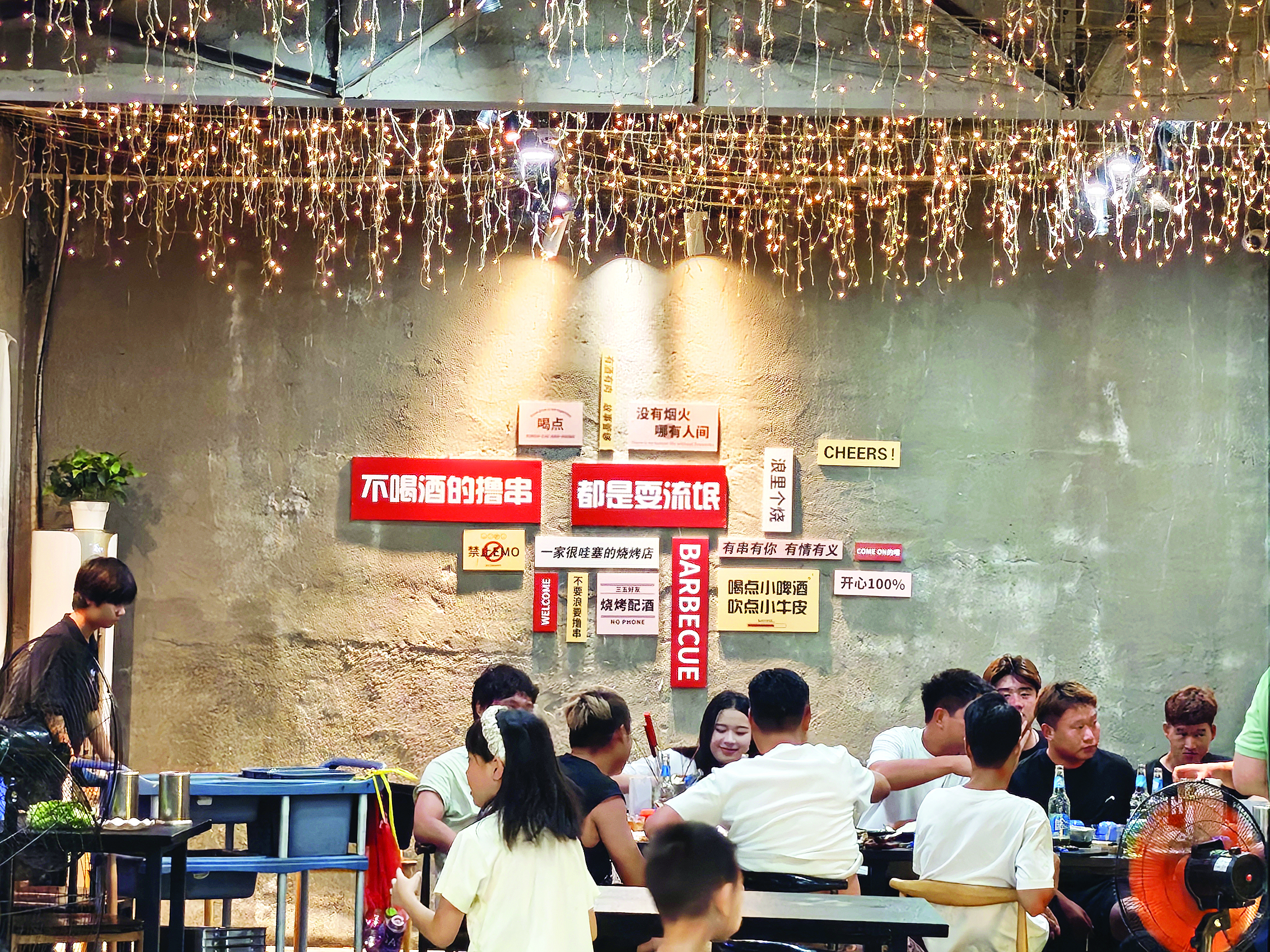 記者實(shí)地探訪發(fā)現(xiàn),打造“美食+美景”場景化消費(fèi)已成為餐飲新趨勢。在市區(qū)河南岸一家燒烤店,直徑2米的3D月球燈、掛滿屋頂?shù)男⌒切菬簟⑽乃嚪稑?biāo)語墻等精心設(shè)計(jì)的打卡點(diǎn)格外醒目!澳贻p人熱衷社交分享,我們定期更新場景布置,既滿足他們的情感需求,又能讓我們的店得到宣傳。”店主王闖道出經(jīng)營心得。