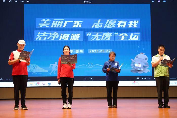 活動(dòng)現(xiàn)場(chǎng)播放了著名田徑運(yùn)動(dòng)員蘇炳添宣傳視頻,呼吁公眾在日常生活中減塑降碳,讓灣區(qū)更美麗;佑斡臼澜绻谲、奧運(yùn)亞軍陳曉君與志愿者代表,一起發(fā)出“美麗廣東 志愿有我 潔凈海灘‘無(wú)廢’全運(yùn)”倡議。