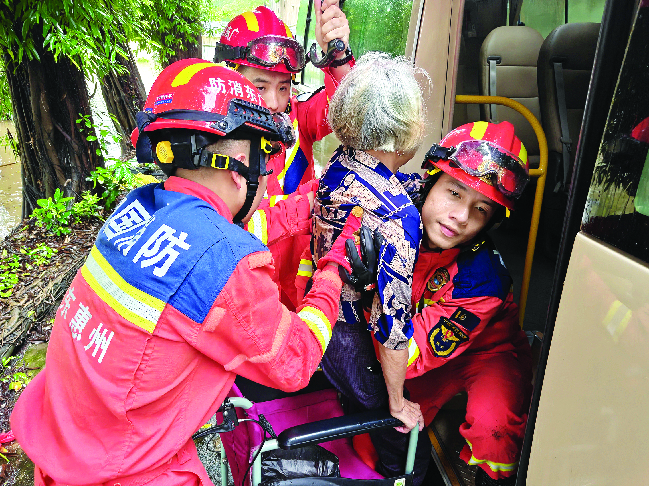 救援隊幫助受困老人轉移;葜菹拦﹫D