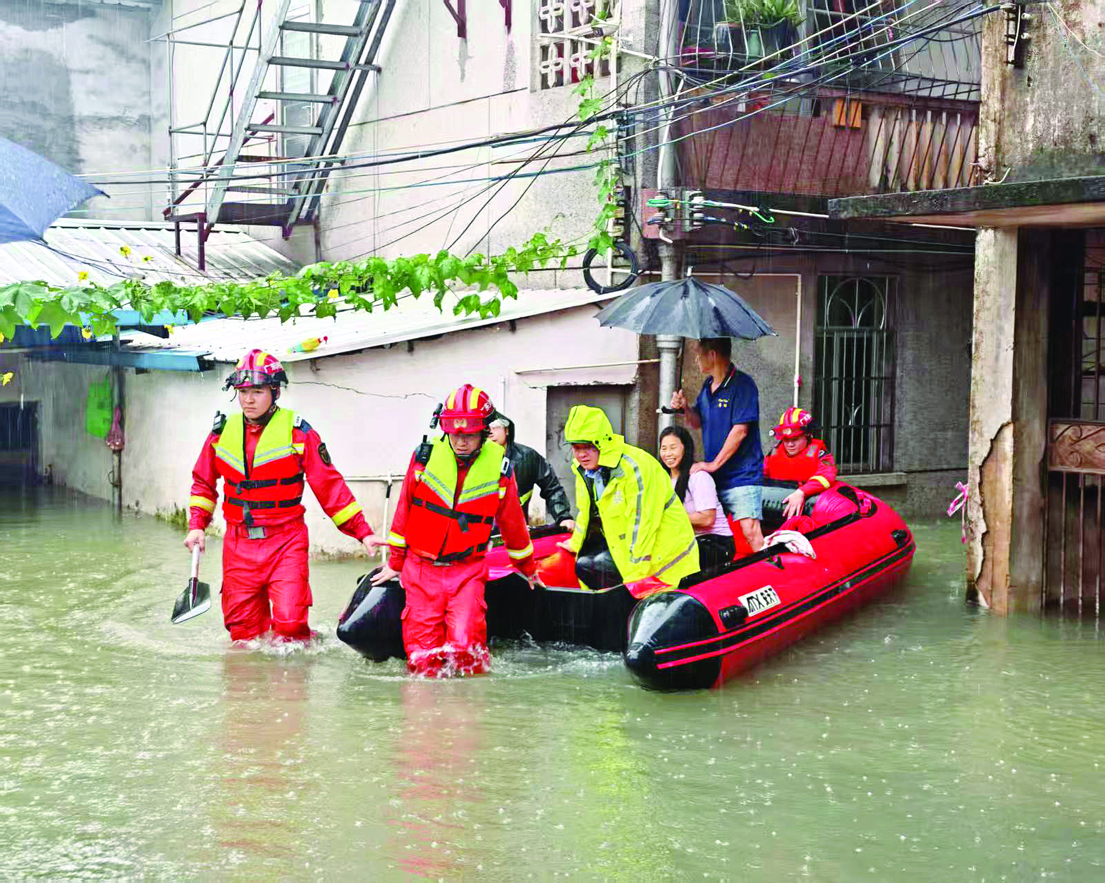 藍(lán)天救援隊(duì)在惠陽淡水街道橋背街轉(zhuǎn)移需要救援的一家四口。 惠州日?qǐng)?bào)記者謝寶樹 攝