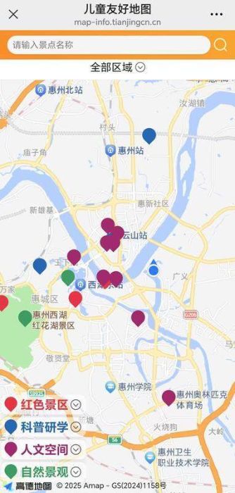 如何查詢兒童友好地圖?搜索“惠州女性”微信公眾號,點(diǎn)擊底部菜單欄“e家園→兒童友好地圖”即可進(jìn)入全市兒童友好點(diǎn)位總覽圖,紅色景區(qū)、科普研學(xué)、人文空間、自然景觀主題點(diǎn)位一目了然,可一鍵直達(dá)。