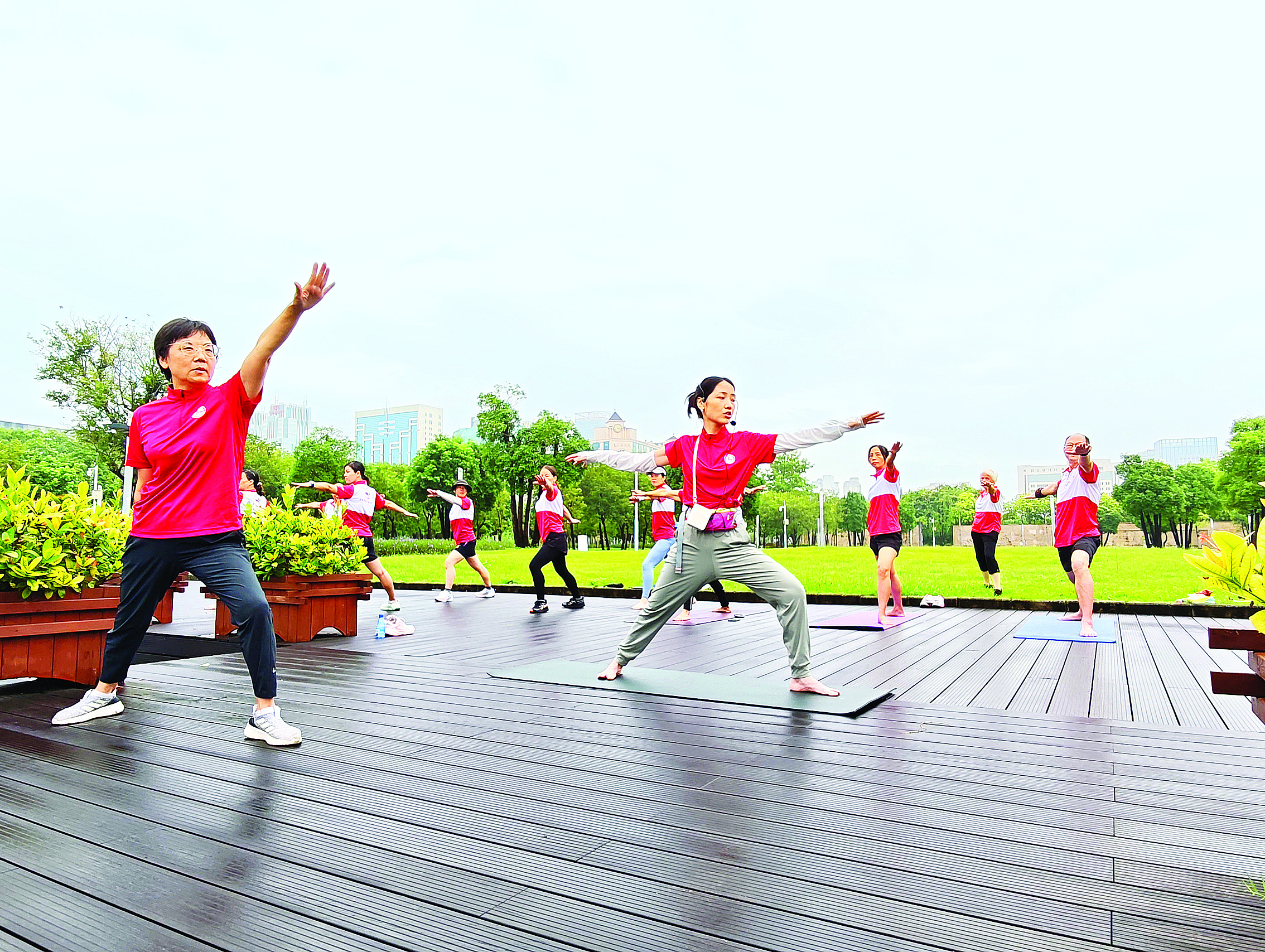 新時代文明實踐(市民公園)撿跑志愿服務(wù)隊每周三早上在市民公園開設(shè)免費瑜伽課;葜萑請笥浾呦憬鹑 攝