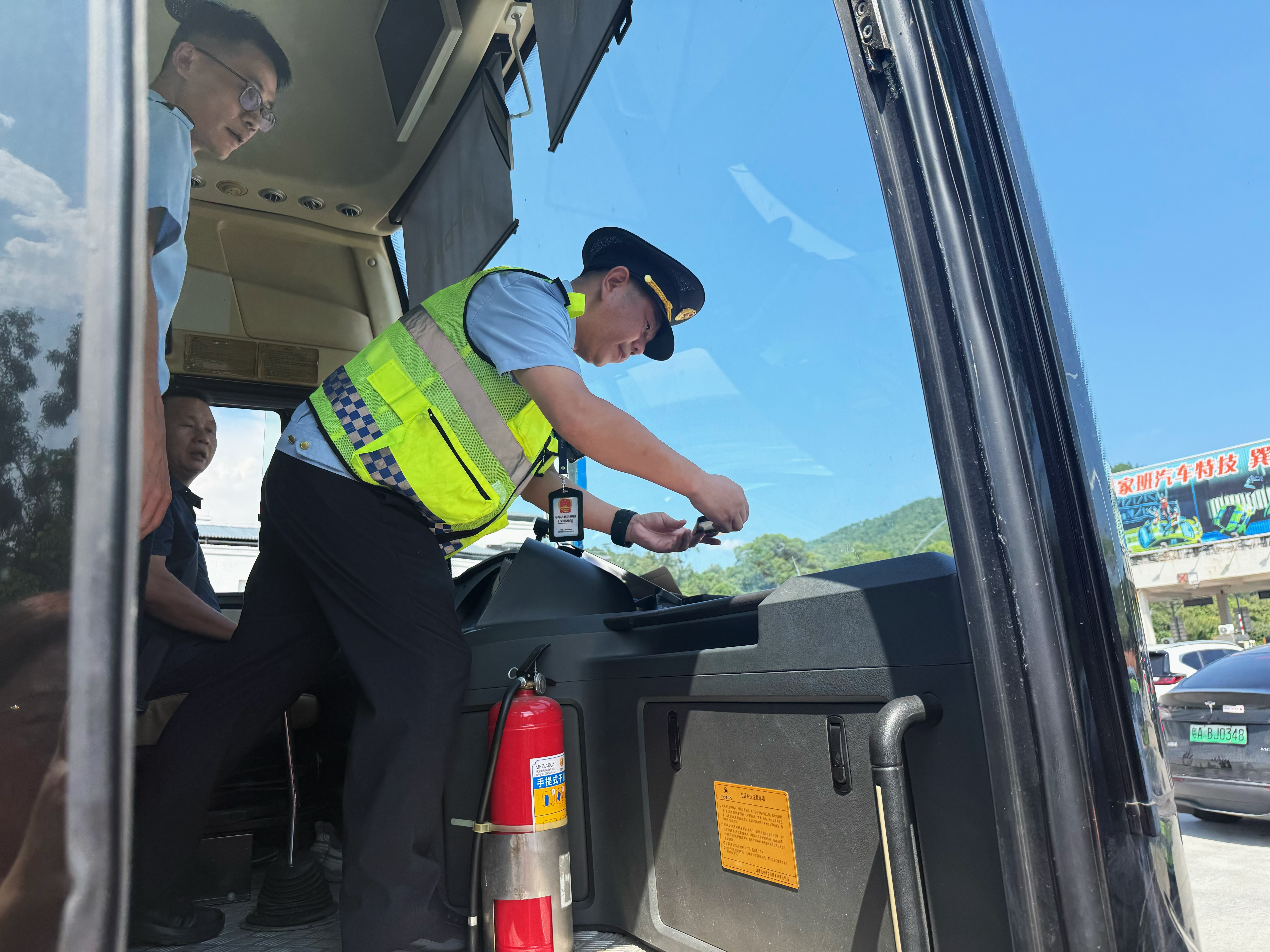 “請(qǐng)出示你的導(dǎo)游證”“有簽訂旅行合同嗎”……當(dāng)天下午3時(shí),在巽寮灣高速出入口,執(zhí)法人員對(duì)過(guò)往的旅游包車逐一排查,在檢查過(guò)程中,發(fā)現(xiàn)有車輛疑似出現(xiàn)證照不全的情況。