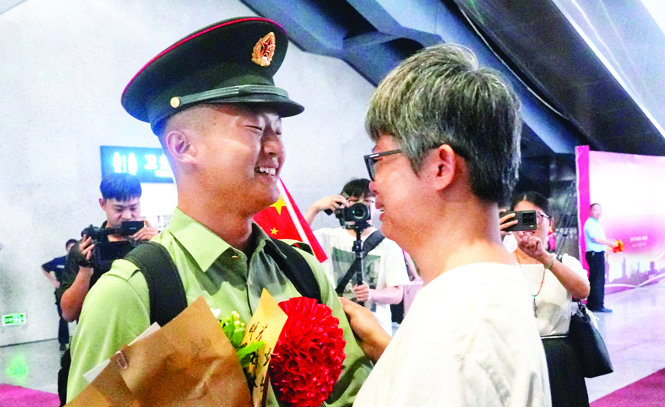 “出來了,出來了……”看到剛到站的退役士兵列隊整齊、步伐鏗鏘地向出站口走來,等候多時的家屬親友們再也按捺不住內(nèi)心的激動,紛紛快步迎上前去。久別的親人終于重逢,一個個緊緊的擁抱、一聲聲親切的問候,頓時讓整個車站化作溫情的海洋。