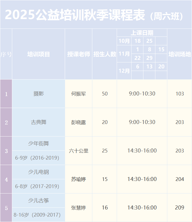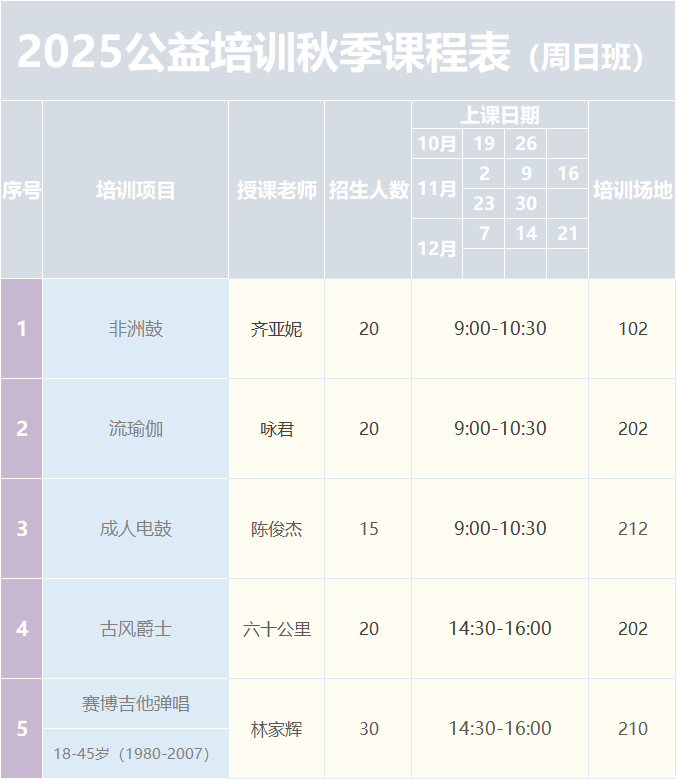 此次培訓(xùn)班課程設(shè)置多樣,既有適合青少年學(xué)習(xí)的少兒街舞、古箏等,也有面向成人的攝影、吉他彈唱等藝術(shù)課程,滿足不同年齡段市民的文化需求。所有課程均免費(fèi)開放,但名額有限,采取線上報(bào)名、后臺(tái)隨機(jī)抽簽的方式錄取。中簽者將收到短信及“文惠圈”站內(nèi)信通知,并于9月20日至21日(10:00-16:00)前往惠州市文化館辦理入學(xué)登記。