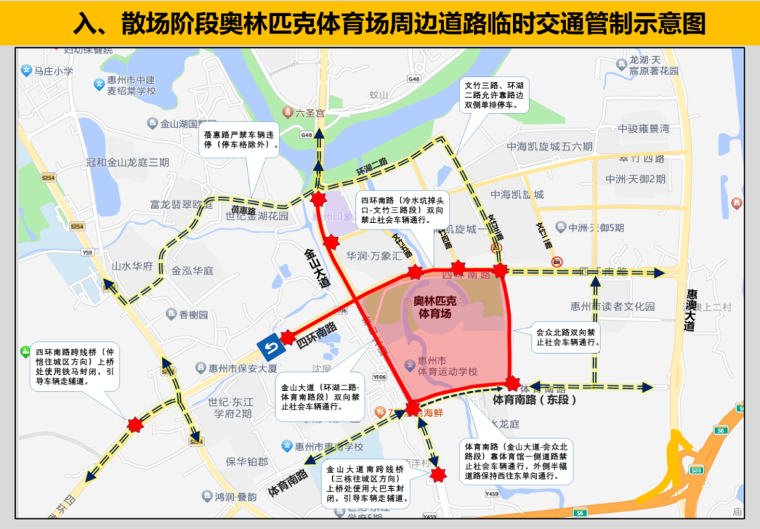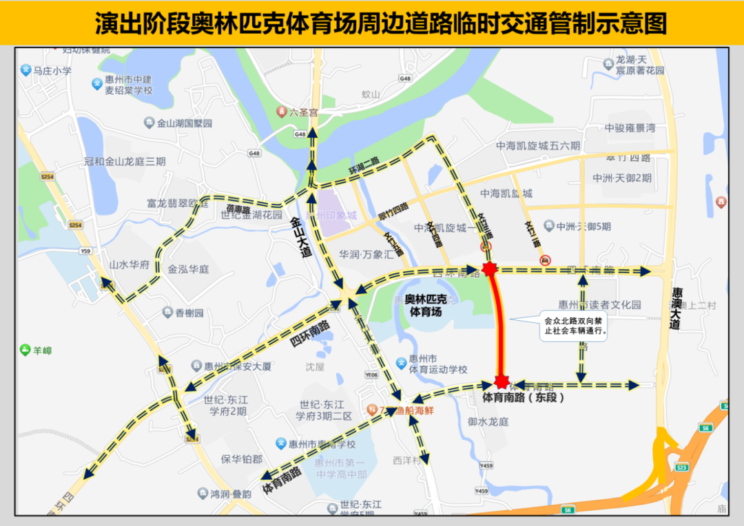 惠州奧林匹克體育場周邊環(huán)湖二路、蓓惠路、演達大道、惠澳大道、體育南路合圍區(qū)域,禁止核載4.5噸以上貨車、危險化學品運輸車輛通行。