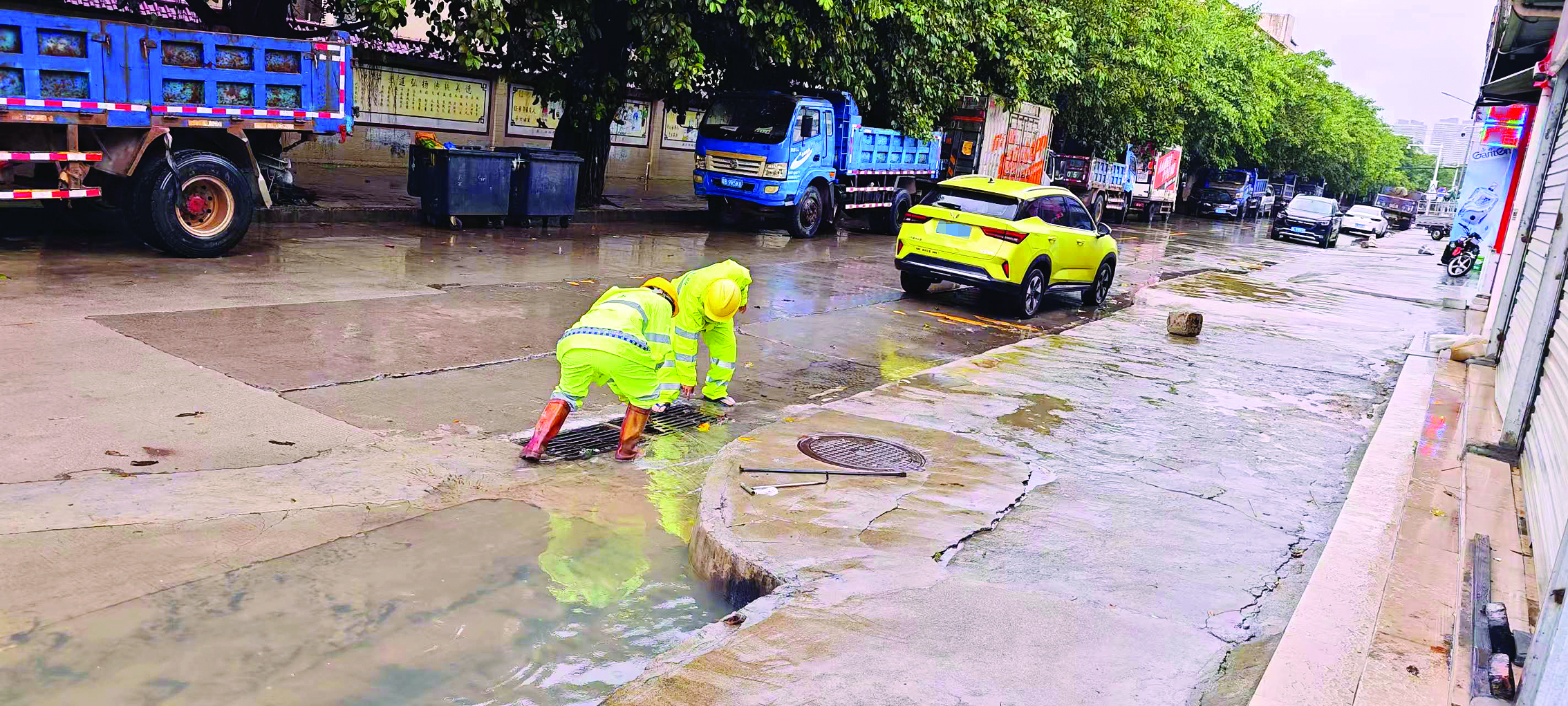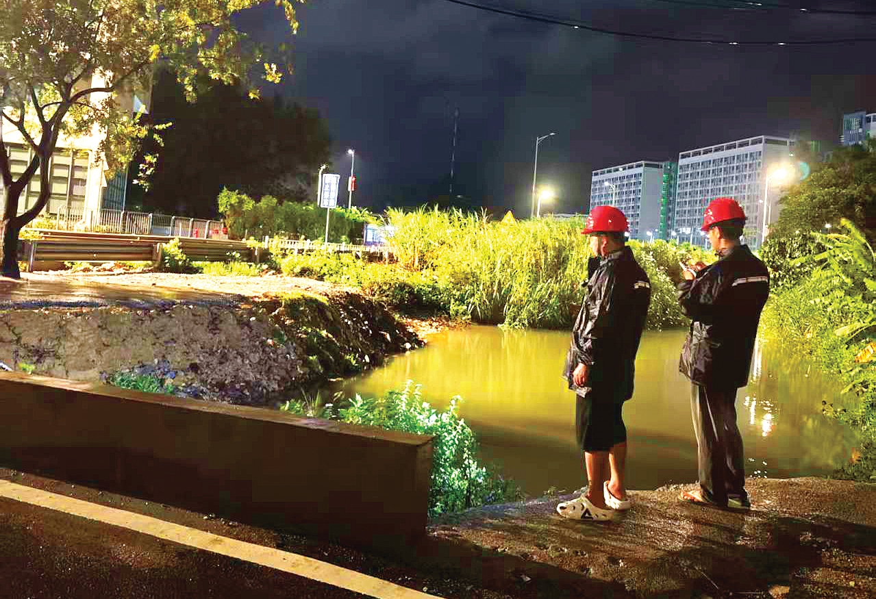 排澇人員及時(shí)疏排積水;葜萑?qǐng)?bào)記者謝菁菁 特約通訊員黎華容 通訊員陳巧梅 攝