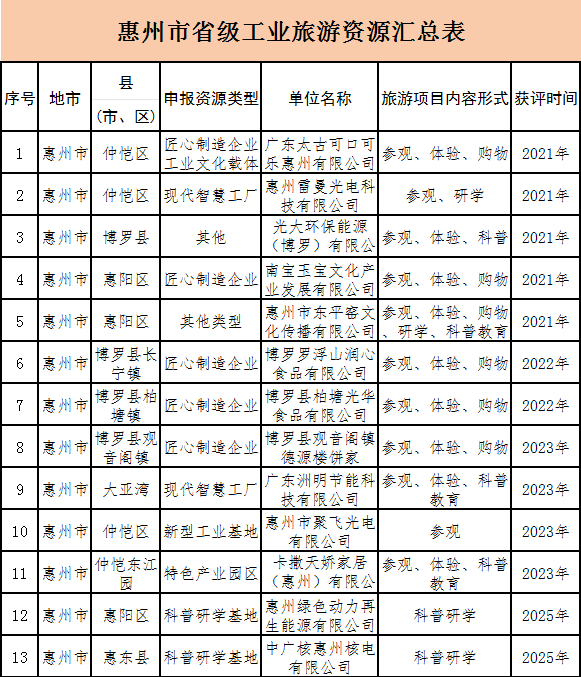 惠州作為“萬億工業(yè)大市”,制造業(yè)發(fā)達,產(chǎn)業(yè)鏈條完整,工業(yè)門類豐富,為工業(yè)旅游這一新興業(yè)態(tài)的發(fā)展提供了廣闊空間;葜莨I(yè)旅游資源豐富,涵蓋科技感滿滿的電子信息產(chǎn)業(yè)、傳統(tǒng)家具、制鞋、服裝產(chǎn)業(yè),以及豆腐花、糕點等非遺制作技藝傳承企業(yè)。這些資源幾乎覆蓋了與市民息息相關(guān)的衣食住行各領(lǐng)域。