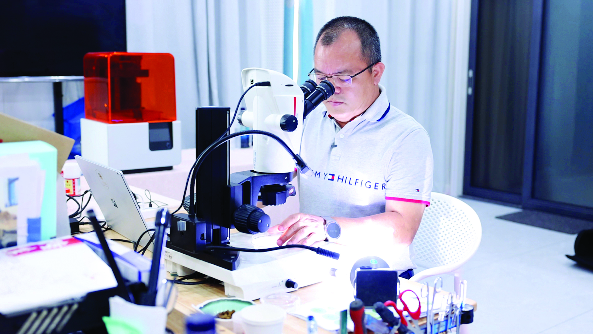 顏闊秋通過(guò)顯微鏡觀察受精卵。