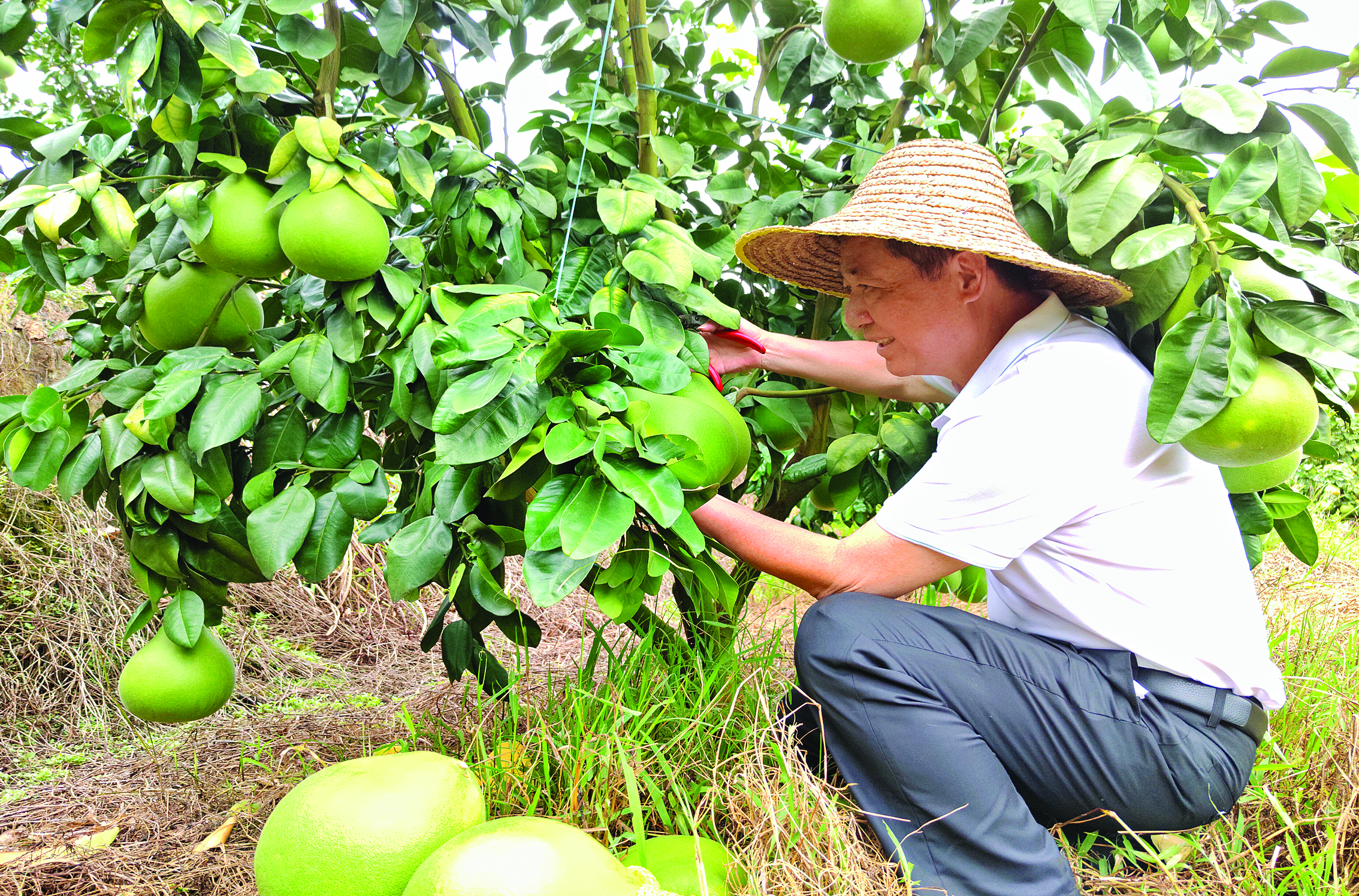 蜜柚沉甸甸地壓彎了枝頭,果農(nóng)高興地采摘柚子。
