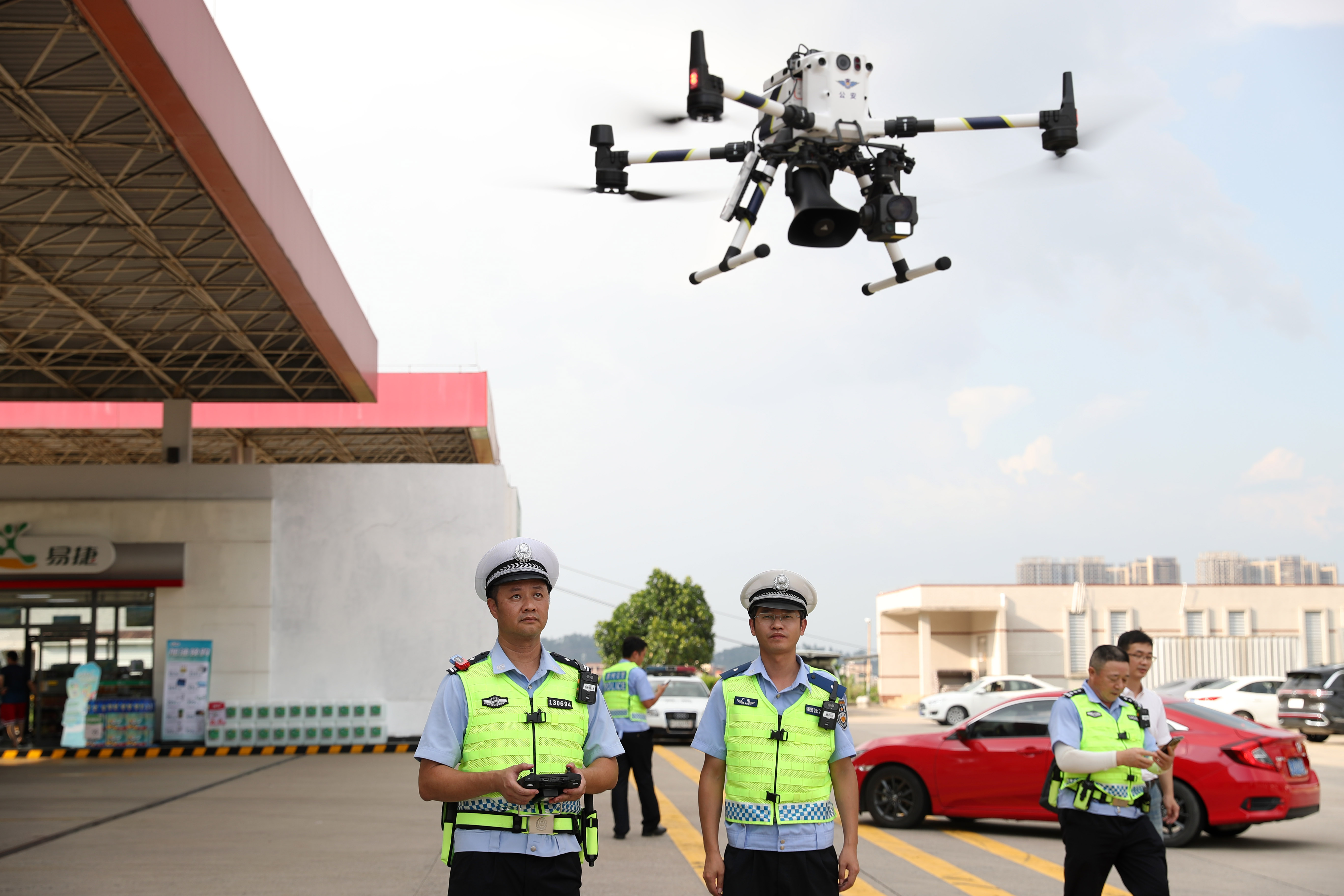 交警在高速公路服務區(qū)利用無人機查看交通情況;葜萑請笥浾邨罱I(yè) 攝
