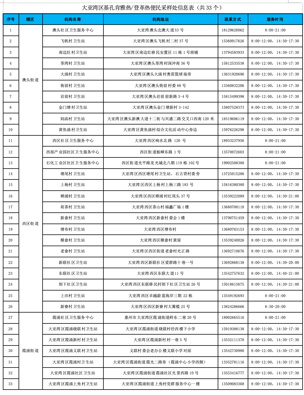 大亞灣區(qū)基孔肯雅熱核酸便民采樣信息表