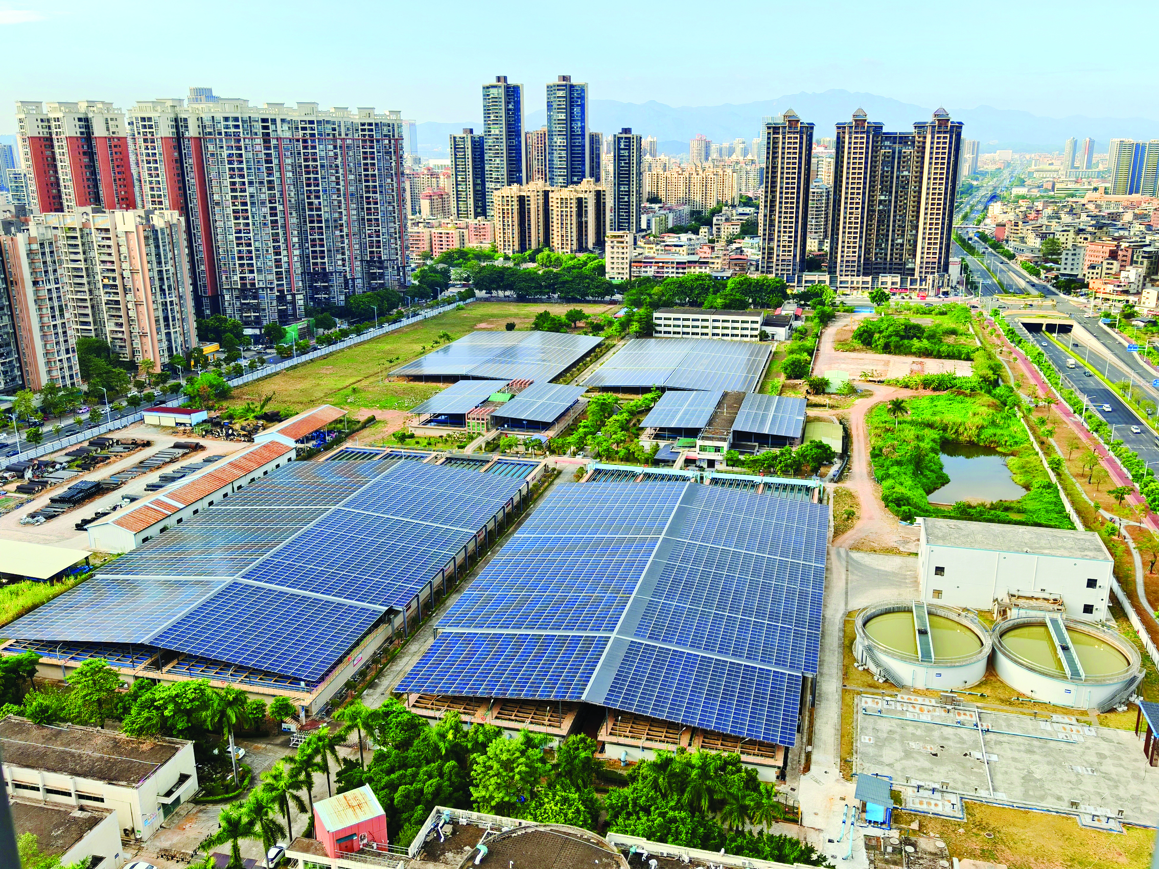 分布式光伏項目的規(guī);瘧(yīng)用則是另一大亮點。站在潼湖水廠、江北水廠辦公樓屋頂,放眼望去,一片深藍(lán)色的光伏板在陽光下熠熠生輝。這些光伏板不僅為水廠遮陽擋雨,更將光能轉(zhuǎn)化為綠色電力。