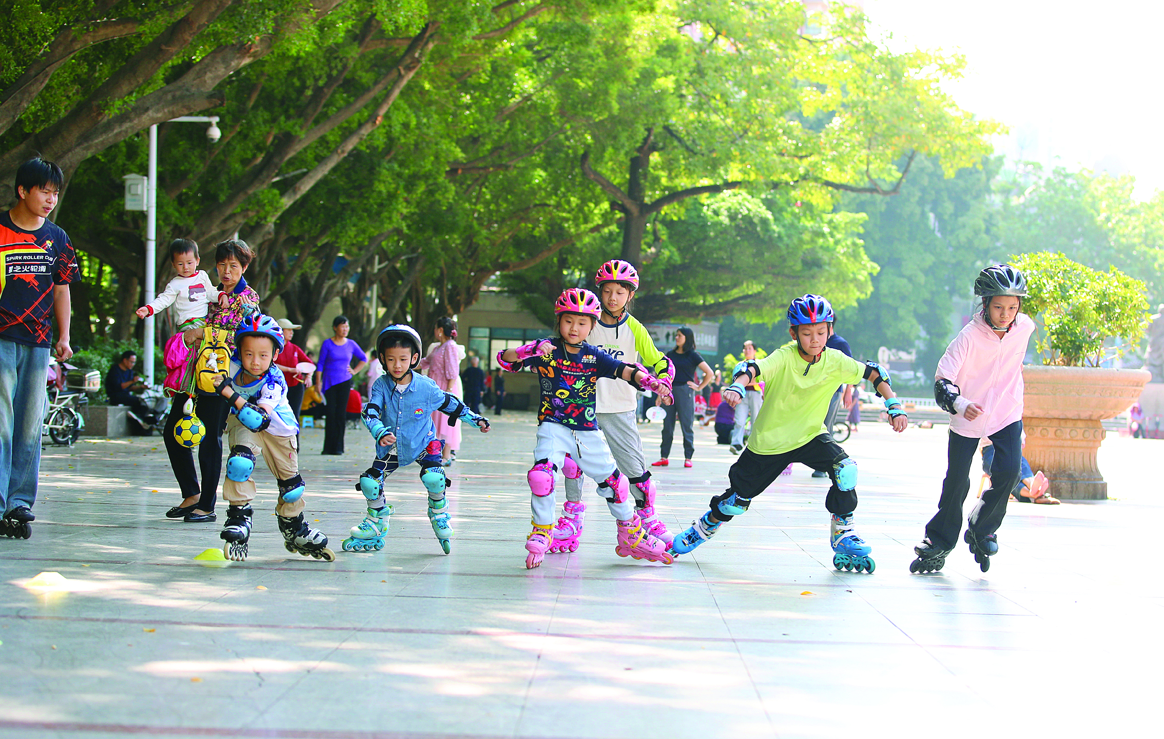 小朋友在濱江公園練習(xí)輪滑。