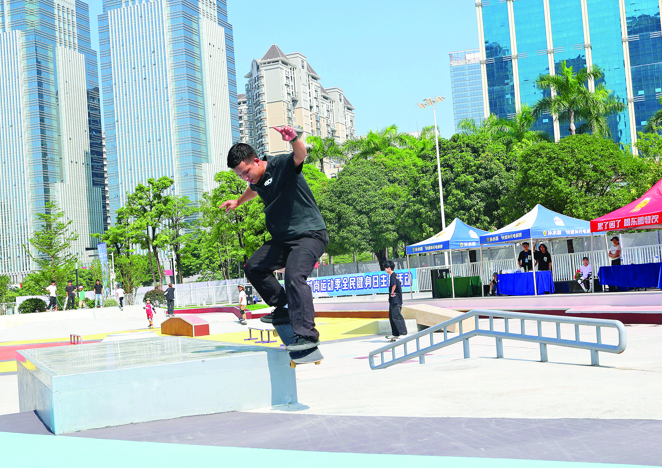 午后,城市公園的輪滑區(qū)變成了青春秀場(chǎng)。腳踏輪滑鞋的少年如風(fēng)般掠過,踩著滑板的青年一次次嘗試空中轉(zhuǎn)體。這里是全運(yùn)會(huì)滑板與輪滑項(xiàng)目的“民間分會(huì)場(chǎng)”。他們的偶像正是在惠州賽場(chǎng)上亮相的運(yùn)動(dòng)員,“看到他們完成高難度動(dòng)作,我們會(huì)在這里模仿、練習(xí)。公園就是我們的訓(xùn)練基地,也許下一個(gè)冠軍,就從這里出發(fā)!