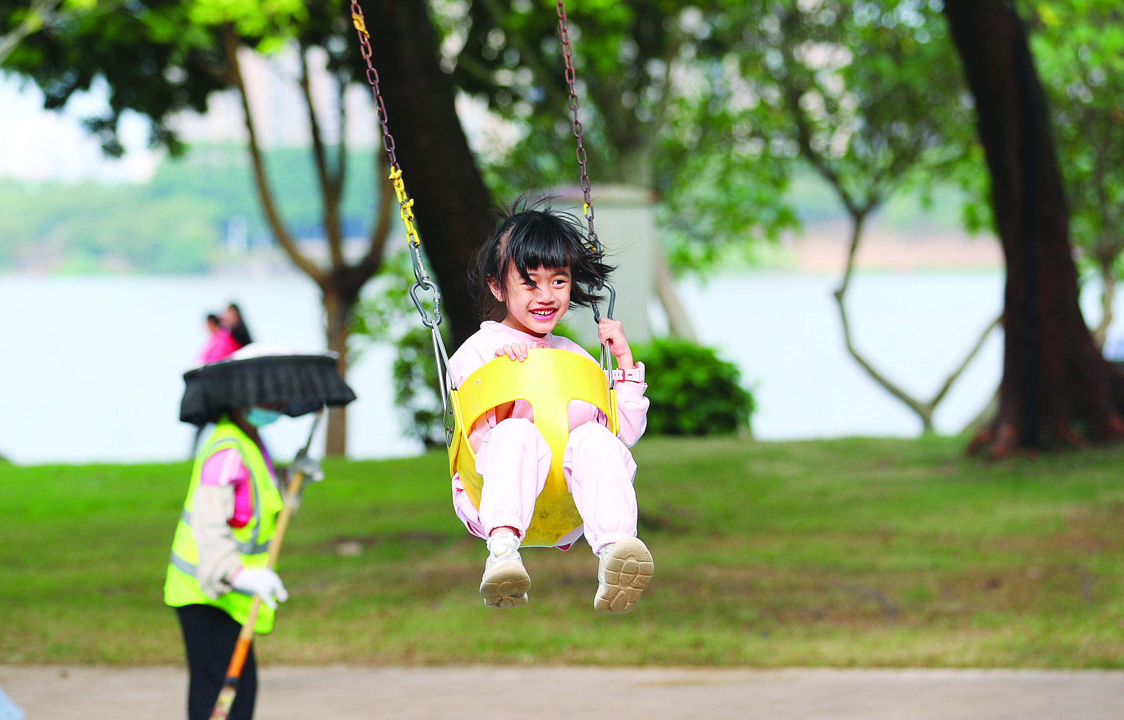 小朋友在東江沙公園蕩秋千。