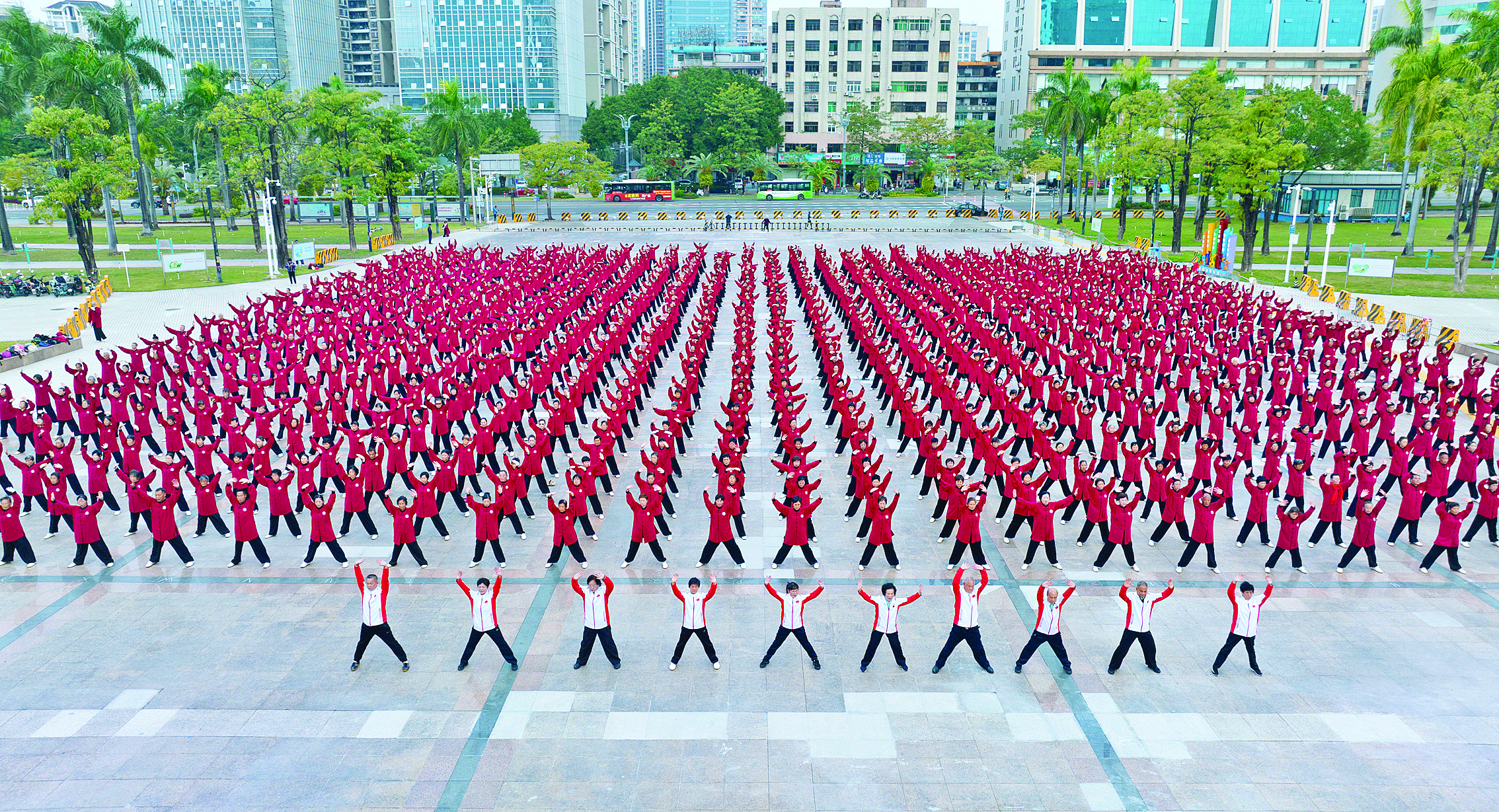 在惠州體育館廣場(chǎng),千人舞太極場(chǎng)面壯觀。