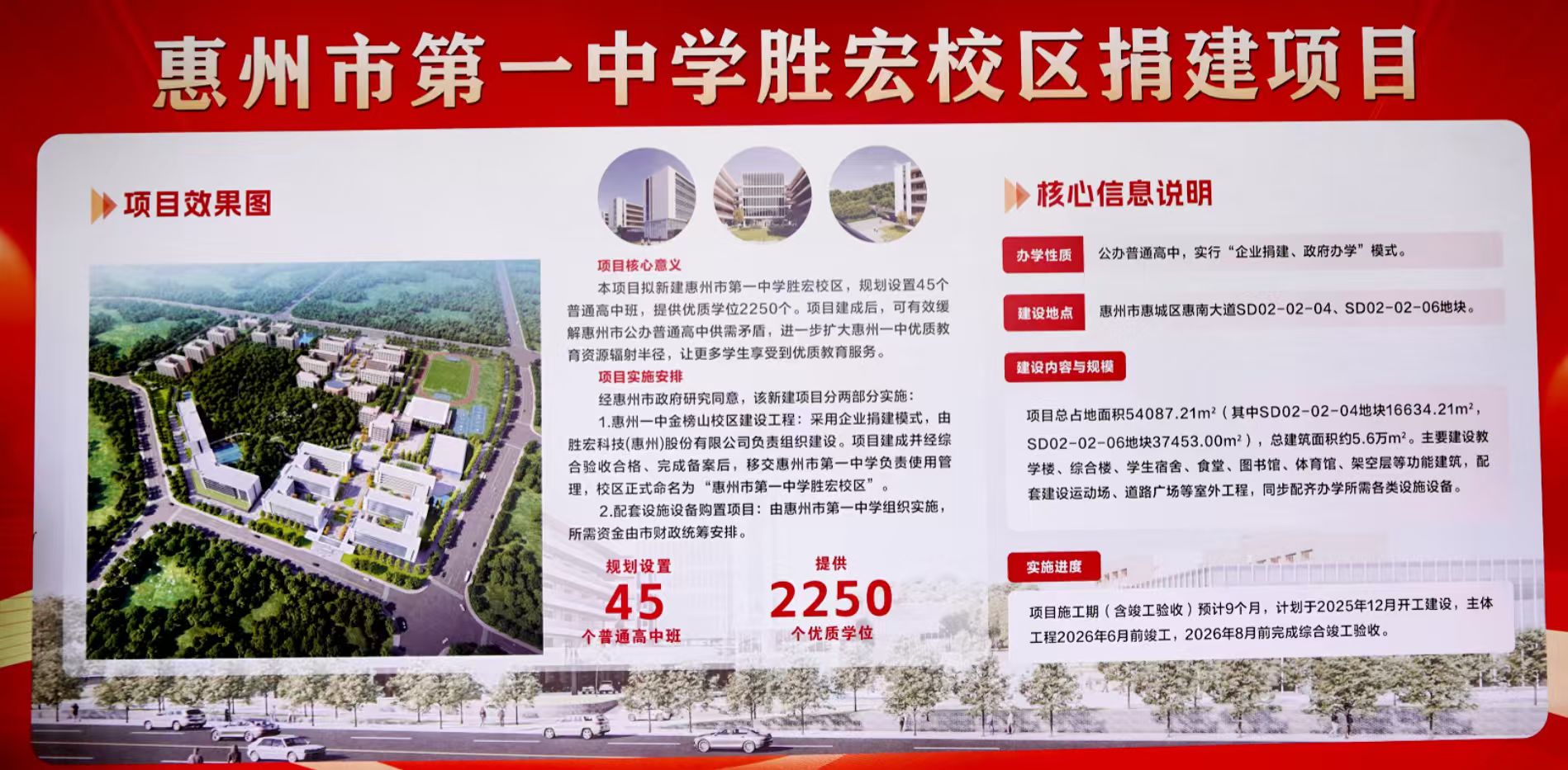 11月27日,勝宏科技(惠州)股份有限公司捐建惠州市第一中學(xué)勝宏校區(qū)簽約儀式在惠州市第一中學(xué)舉行。項(xiàng)目位于惠州市第一中學(xué)金山湖校區(qū)旁,規(guī)劃45個高中班、2250個優(yōu)質(zhì)學(xué)位,2025年12月開工,2026年8月前完成驗(yàn)收移交,將大幅緩解惠州公辦高中學(xué)位壓力,讓更多學(xué)子享優(yōu)質(zhì)教育資源。