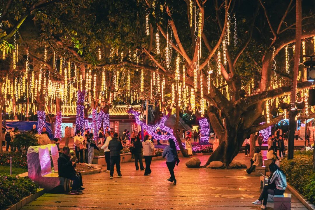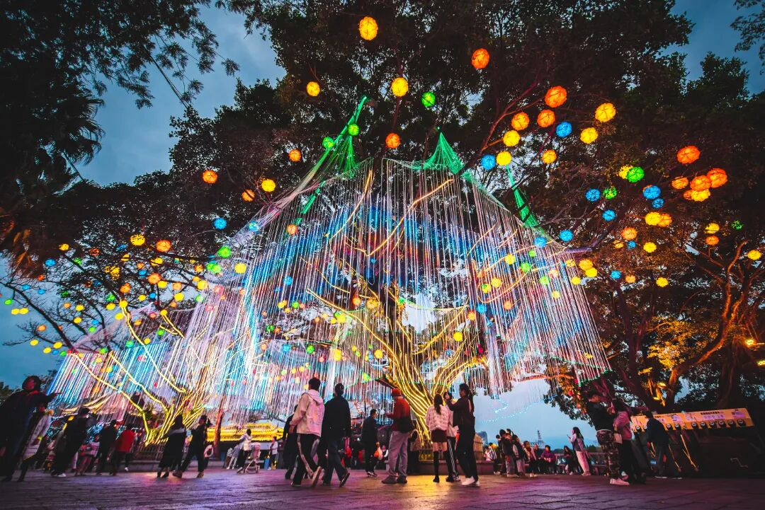 兩旁參天大榕樹在燈光的映照下七彩變幻