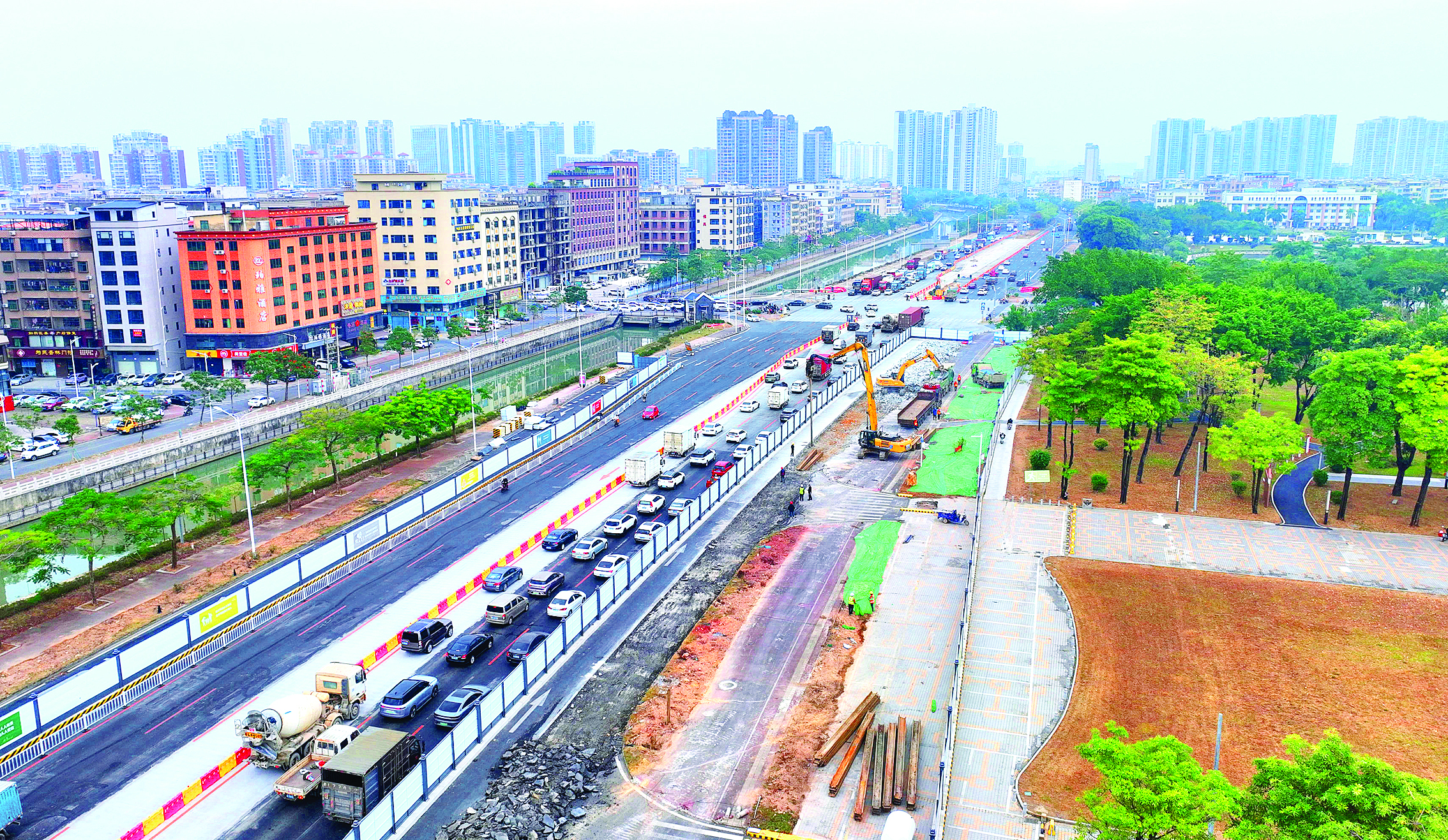 位于惠澤大道東江灣段的施工點(diǎn)則是另一番景象。這里的中央綠化帶已被拆除,裸露的土地正被迅速硬化成平整的臨時(shí)路面。施工現(xiàn)場(chǎng)雖繁忙,但車(chē)流依然保持著雙向四車(chē)道的通行規(guī)模,并未出現(xiàn)嚴(yán)重?fù)矶。“先借綠化帶空間增建臨時(shí)車(chē)道,再將兩側(cè)擴(kuò)建非機(jī)動(dòng)車(chē)道和人行道的區(qū)域圍蔽施工,這樣就可以兼顧施工和車(chē)輛通行!绷_志勇說(shuō)。