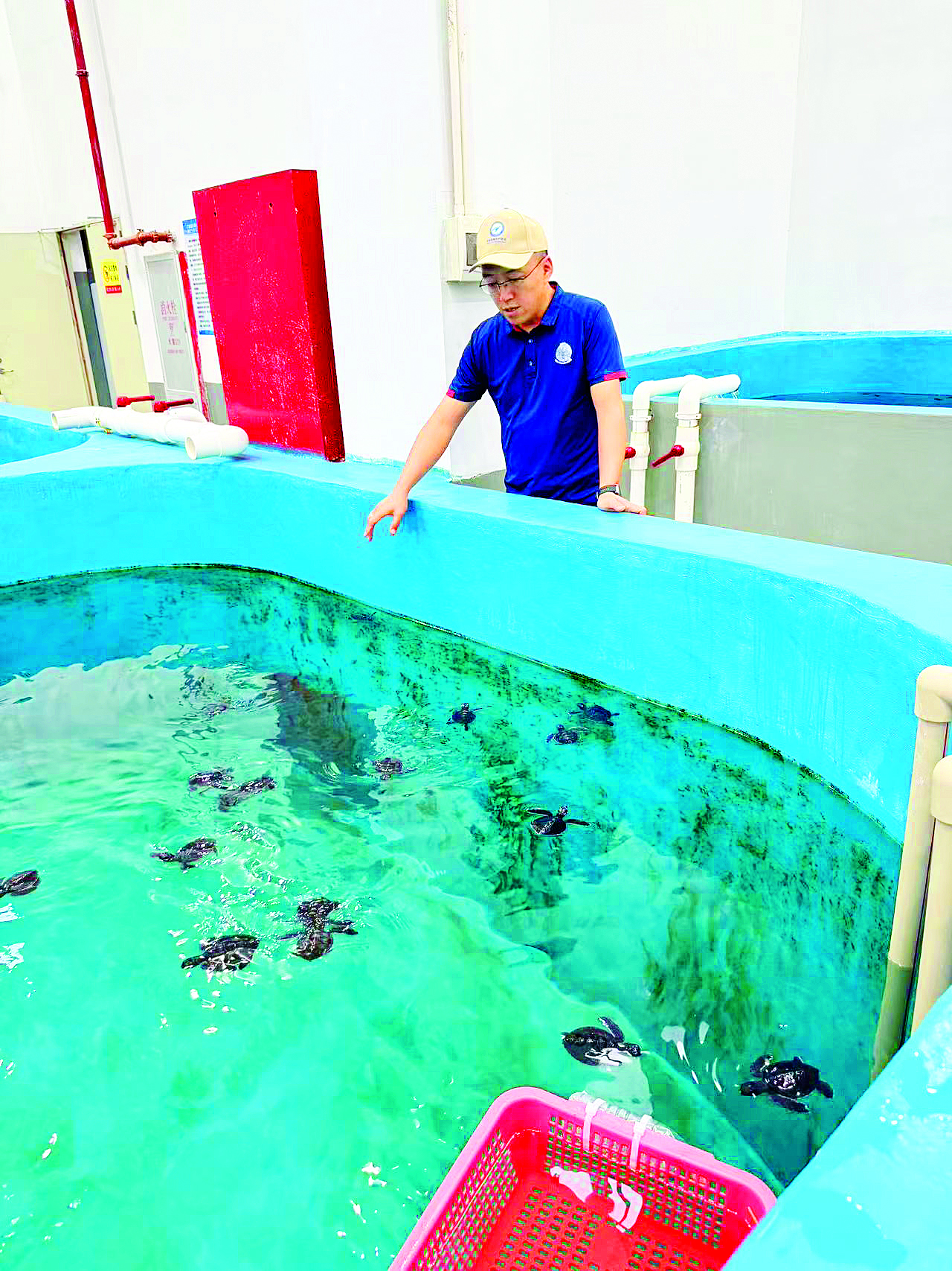 那么他是如何從一個(gè)海缸養(yǎng)殖愛好者變成工程師呢?“2018年,我跟一位老板來海龜灣工作,與保護(hù)區(qū)交流頻繁,他們知道了我對海水養(yǎng)殖方面有很深的研究!毙ざㄜ娬f,經(jīng)過多年的觀察和配合,他于2021年正式被廣東惠東港口海龜國家級自然保護(hù)區(qū)聘用,主要負(fù)責(zé)海龜幼苗的養(yǎng)殖。