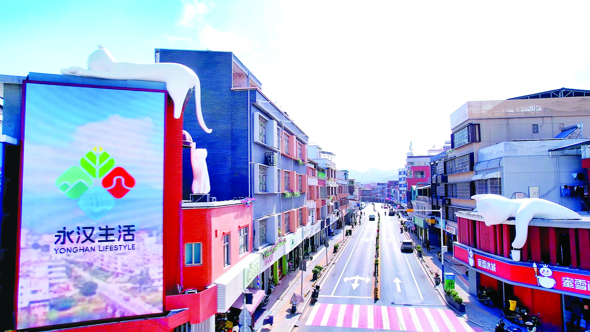 龍門縣永漢鎮(zhèn)打造豹貓IP形象,將其融入街頭店鋪房頂,讓圩鎮(zhèn)別有一番趣味;葜輺|江圖片社供圖