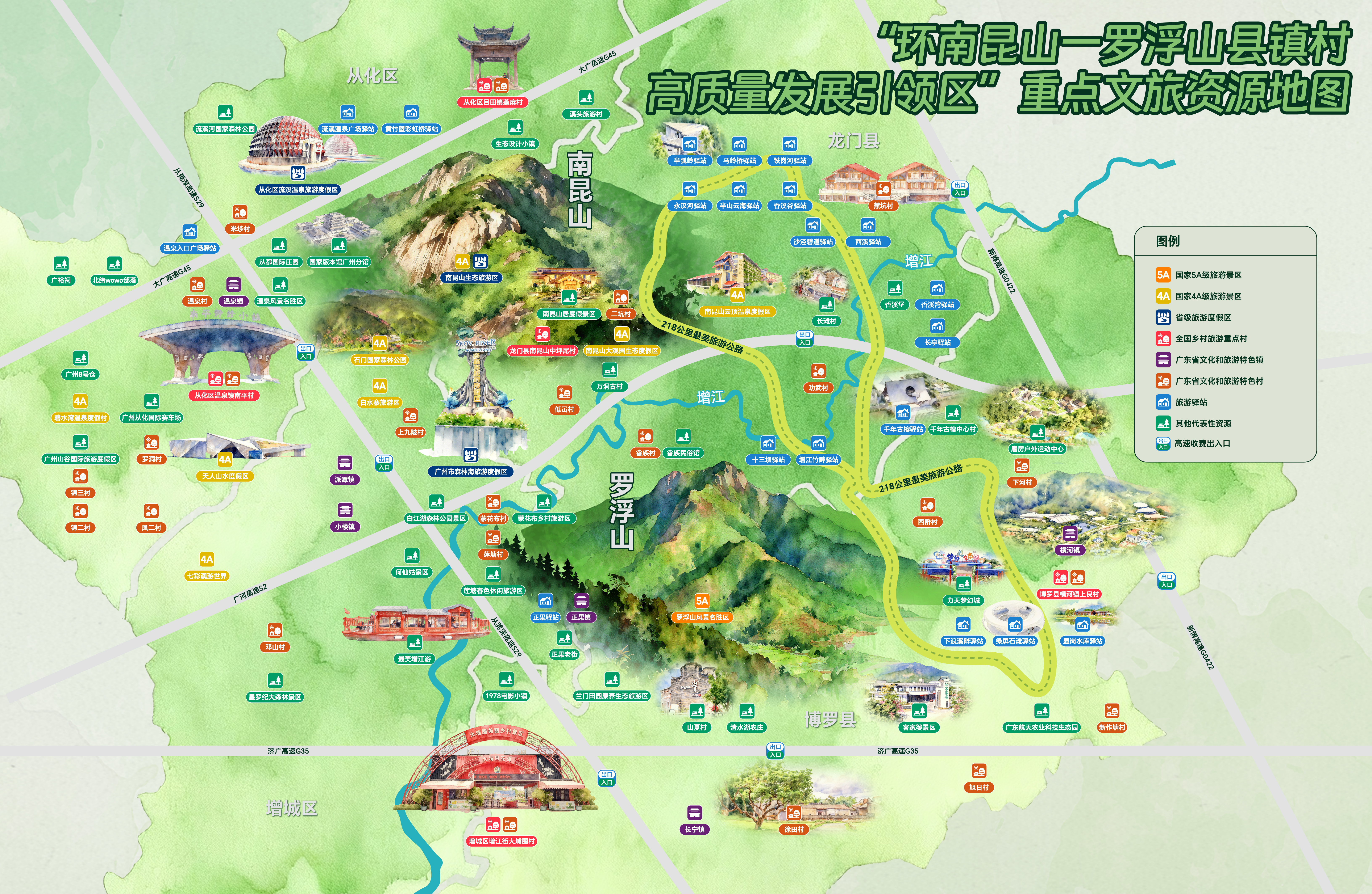 環(huán)南昆山—羅浮山縣鎮(zhèn)村高質量發(fā)展引領區(qū)是以南昆山、羅浮山為核心區(qū)域的省級戰(zhàn)略部署發(fā)展的重要區(qū)域,覆蓋廣州市從化區(qū)和增城區(qū)、惠州市博羅縣和龍門縣的23個鎮(zhèn)街、2個管委會,總面積4933.7平方公里。引領區(qū)作為廣東省“百縣千鎮(zhèn)萬村高質量發(fā)展工程”的重點發(fā)展區(qū),以構建粵港澳大灣區(qū)生態(tài)花園、世界級森林溫泉康養(yǎng)目的地、嶺南特色縣鎮(zhèn)村現(xiàn)代化建設樣板、城鄉(xiāng)融合發(fā)展先行地為戰(zhàn)略定位,積極探索區(qū)域協(xié)同、城鄉(xiāng)共同繁榮的縣鎮(zhèn)村高質量發(fā)展新路徑。截至目前,區(qū)域內共有國家5A級旅游景區(qū)1個,國家4A級旅游景區(qū)8個,省級旅游度假區(qū)3個,全國鄉(xiāng)村旅游重點村5個,廣東省文化和旅游特色鎮(zhèn)6個,廣東省文化和旅游特色村24個,旅游驛站20個,其他代表性資源34個。