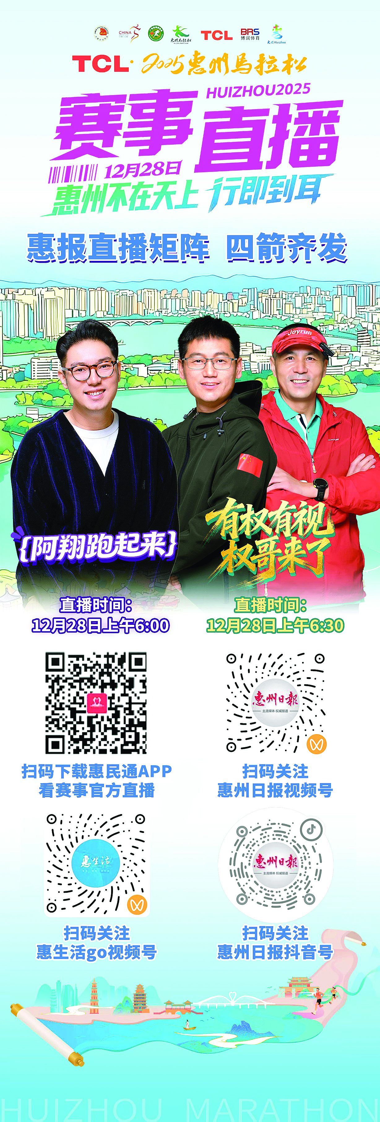 本次直播矩陣包括:惠州日?qǐng)?bào)社旗下“惠州惠民通”APP將實(shí)時(shí)轉(zhuǎn)播賽事官方信號(hào),提供權(quán)威賽事全景;在微信視頻號(hào)及抖音平臺(tái),由本報(bào)記者、“有權(quán)有視”欄目主播李松權(quán)攜手知名跑者“百馬王子”文懿教練,以“第一視角”進(jìn)行移動(dòng)直播,直擊賽道核心動(dòng)態(tài);“惠生活go”視頻號(hào)將推出特色沉浸式直播,由本報(bào)記者、“阿翔跑起來(lái)”欄目主播,同時(shí)也是參賽跑者的黃宇翔領(lǐng)銜,代入跑者親身感受。