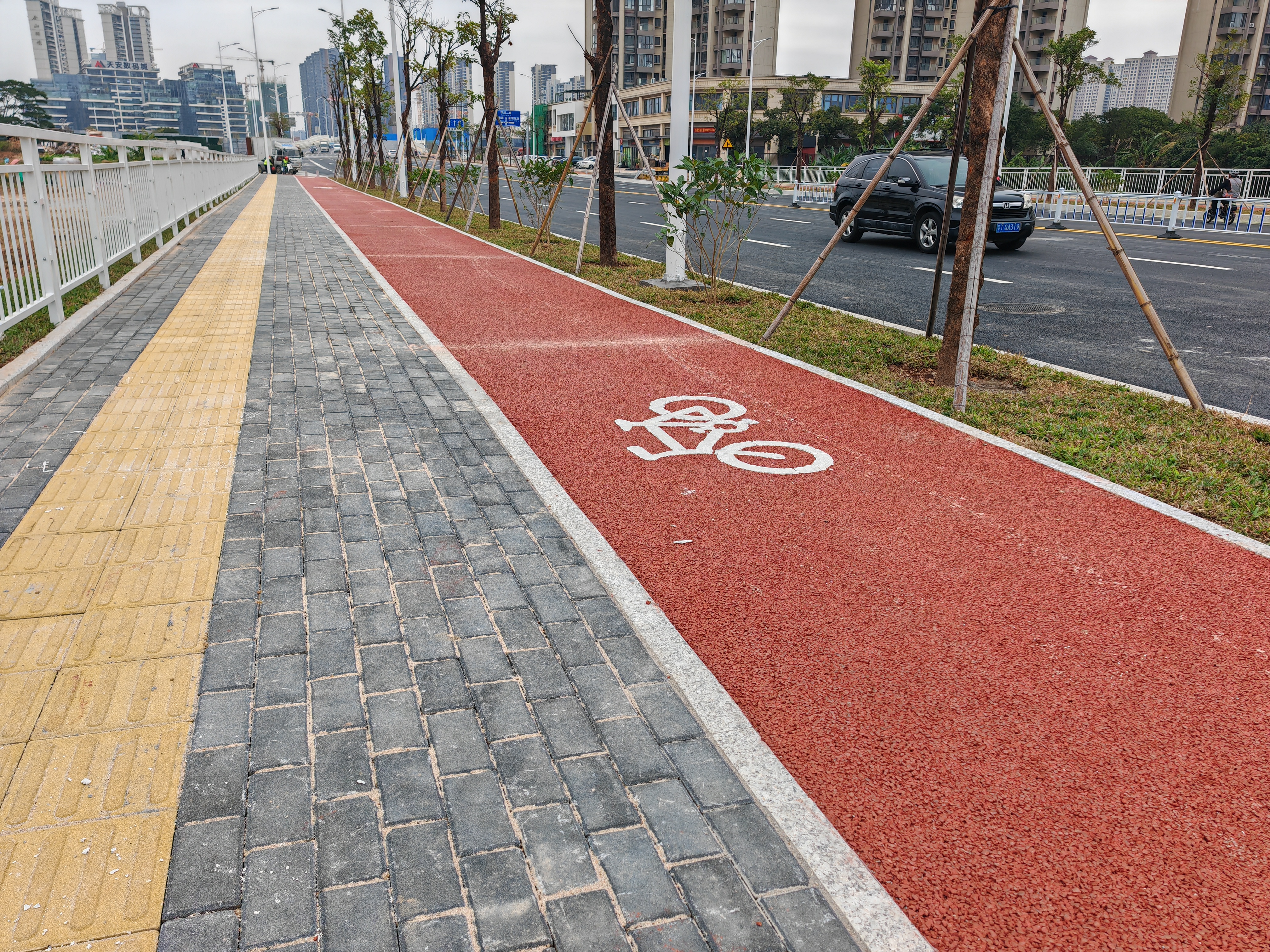 劉強(qiáng)特別指出,工程突出了“交通+生態(tài)”的融合設(shè)計(jì)理念。道路兩側(cè)規(guī)劃了各2米寬的綠化隔離帶,精選秋楓、狗牙花等鄉(xiāng)土樹種,構(gòu)建多層次景觀。同時(shí)打造的生態(tài)植草邊坡,增強(qiáng)了雨水的自然滲透與凈化能力,旨在為市民提供一條綠色、低碳的出行通道。