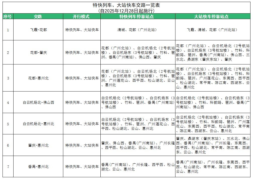 此次運(yùn)行圖調(diào)整主要是增加“白云機(jī)場(chǎng)北-惠州北”特快列車、大站快車交路,新增竹料站為特快列車、大站快車停靠點(diǎn);站站停交路“飛霞-竹料”調(diào)整為“飛霞-花都”“花都-竹料”,廣清城際鐵路沿線的旅客若需前往其他城際線路可通過(guò)花都站進(jìn)行換乘。