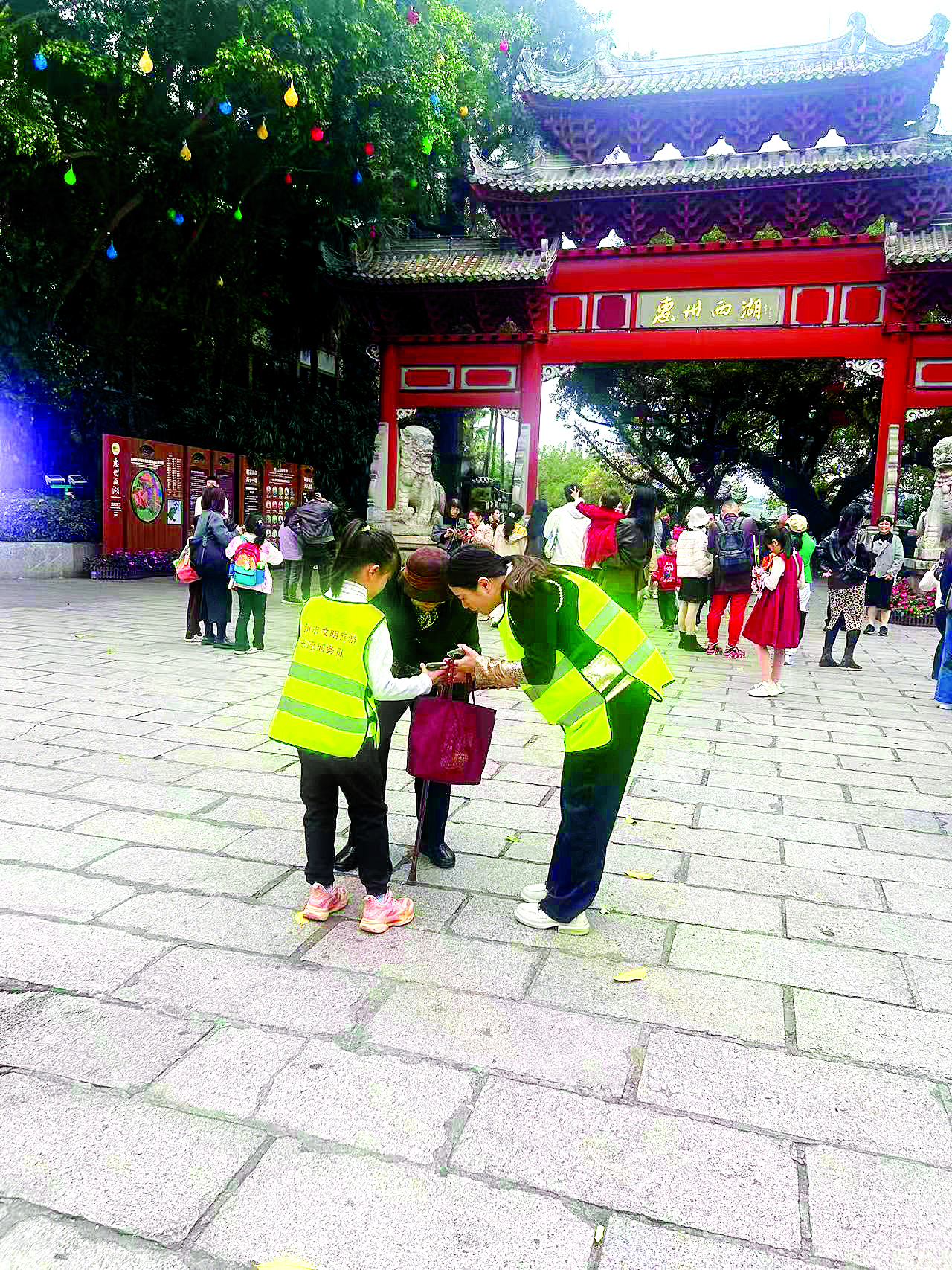 志愿者不僅進(jìn)行文明引導(dǎo),還化身“惠州旅游代言人”。除了黃玉婷推薦的“步行街-水東街-東江游船”經(jīng)典路線,志愿者還會(huì)根據(jù)游客的不同需求,推薦豐渚園賞花、朝京門觀景、高榜山登高等多樣化選擇,讓游客深度體驗(yàn)“半城山色半城湖”的惠州之美。