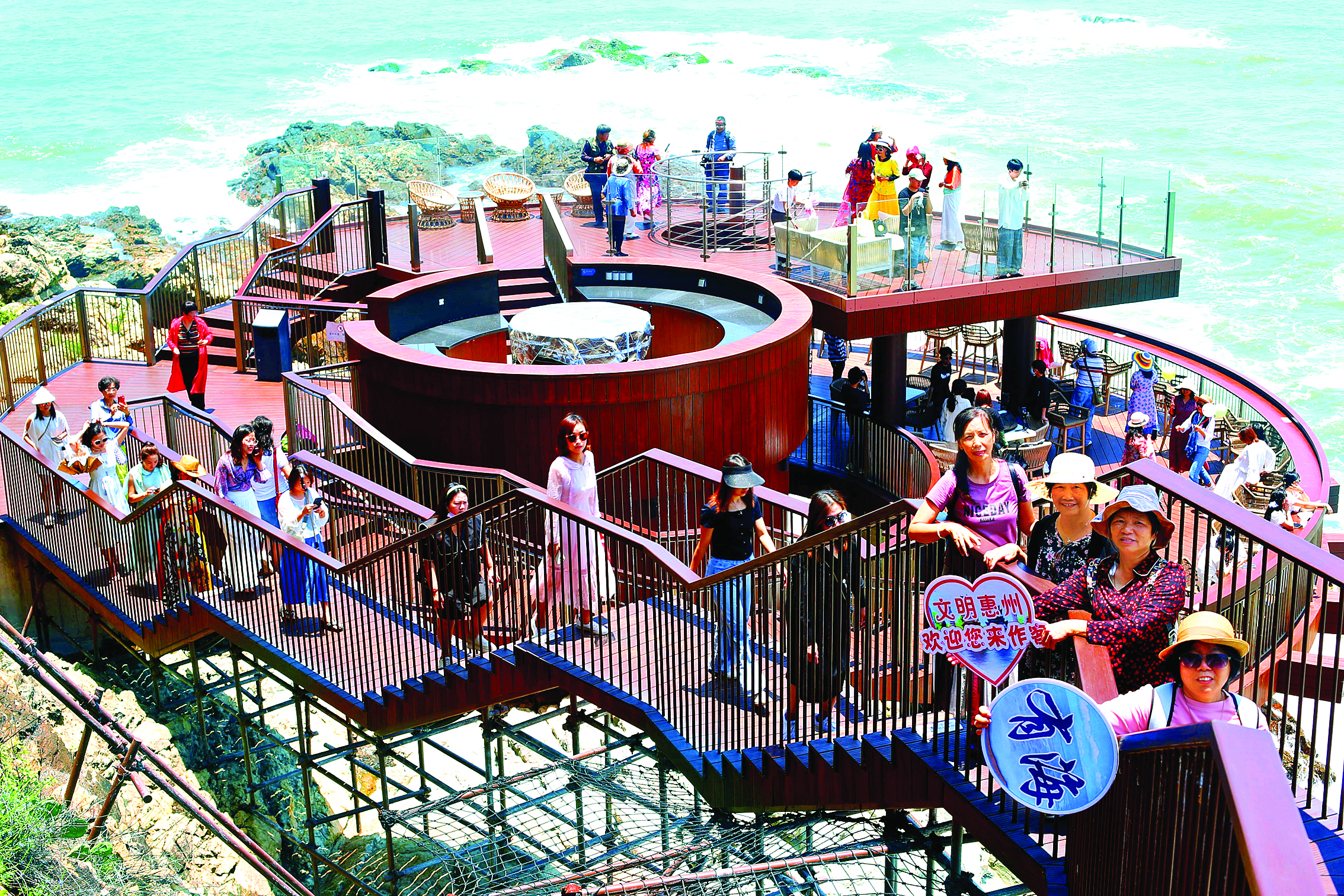 游客打卡惠東雙月灣礁石酒吧。惠州東江圖片社供圖