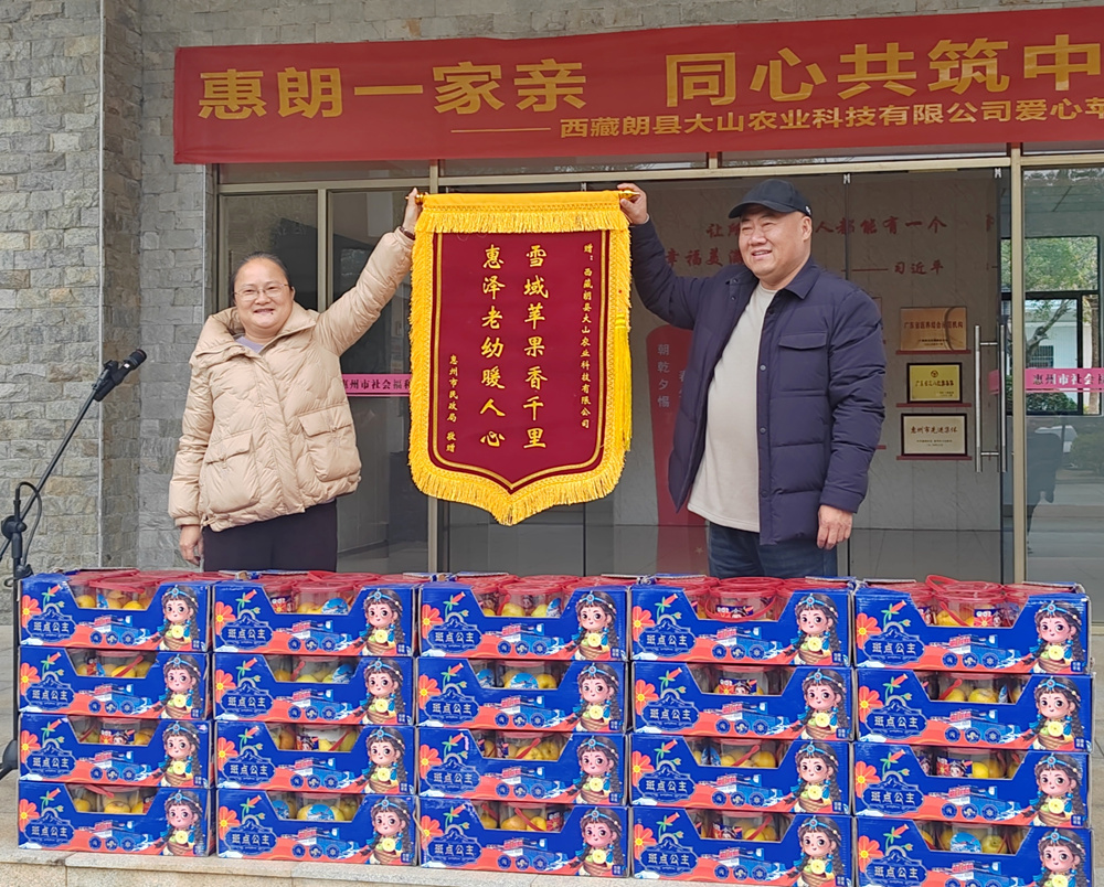 楊威表示,捐贈的1448箱帶著雪域高原純凈氣息的蘋果,承載著朗縣人民對惠州親人的深厚情誼,能為“一老一小”送去關(guān)懷,是企業(yè)的榮幸與責(zé)任。此次捐贈活動的成功舉辦,離不開廣東省第十一批援藏工作隊朗縣工作組的傾情牽線與全力對接。廣東省第十一批援藏工作隊朗縣工作組組長、惠州市政府副秘書長、朗縣縣委常務(wù)副書記、常務(wù)副縣長黃其蔚深情回顧了粵藏兩地、惠朗之間的深厚情誼。他表示,廣東省第十一批援藏工作隊朗縣工作組始終致力于搭建兩地交流的橋梁,此次愛心蘋果捐贈正是援藏工作中“民心相通”的生動實踐,讓山海相隔的惠朗兩地心貼得更近、情連得更緊。