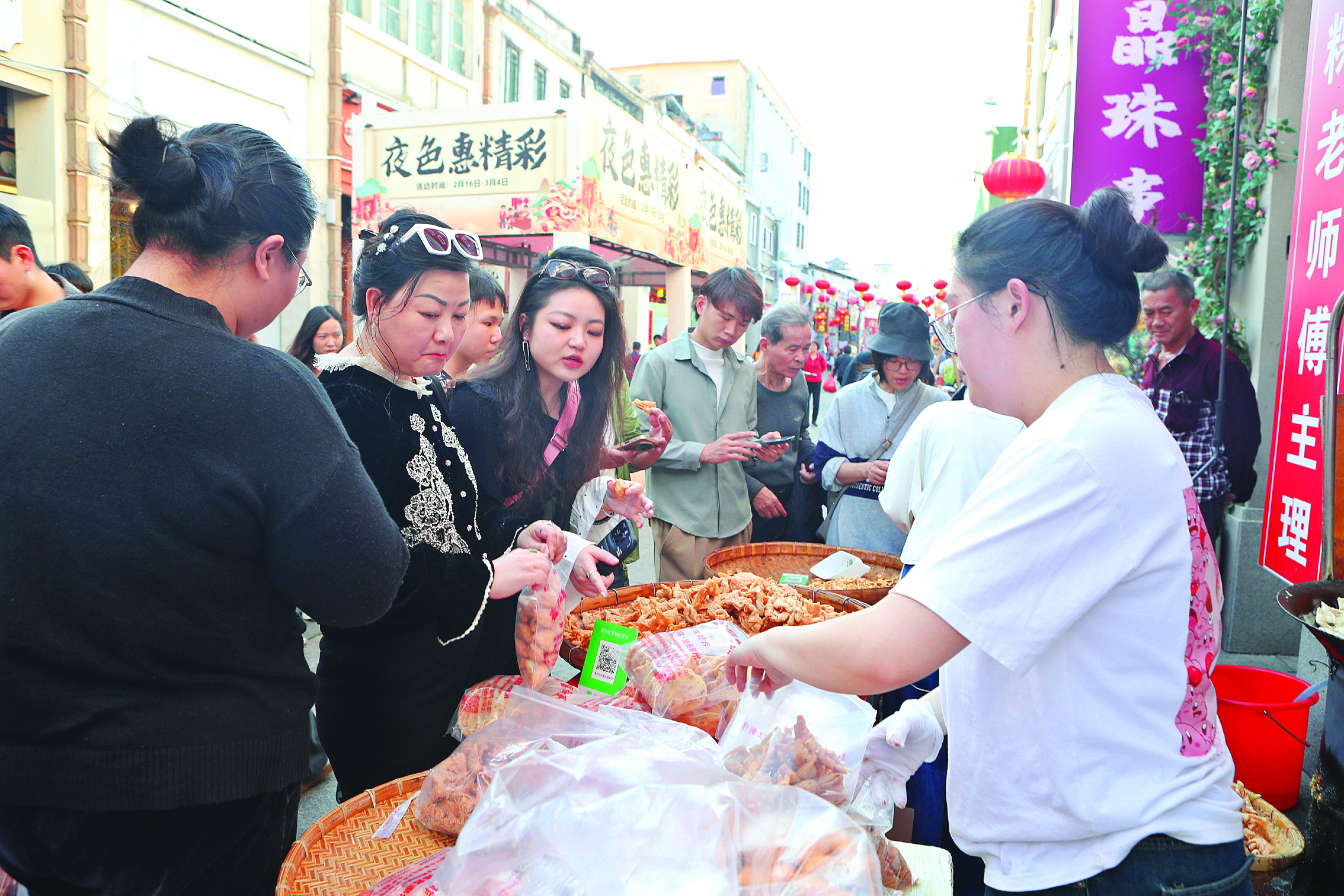 除了水東街,惠城區(qū)橋西市場(chǎng)、步行街的年貨小吃攤位前同樣人氣爆棚。橋西市場(chǎng)入口處,幾家售賣蛋散、鐵勺餅的攤位前,試吃、稱重、打包的市民絡(luò)繹不絕。“每年都買,老惠州人的最愛,既能自家吃,也能當(dāng)伴手禮送人!笔忻駝⒁桃淮涡再I了五份,她說(shuō),這些手工小吃承載著自己從小到大的春節(jié)記憶,少了它們,年就少了幾分滋味。