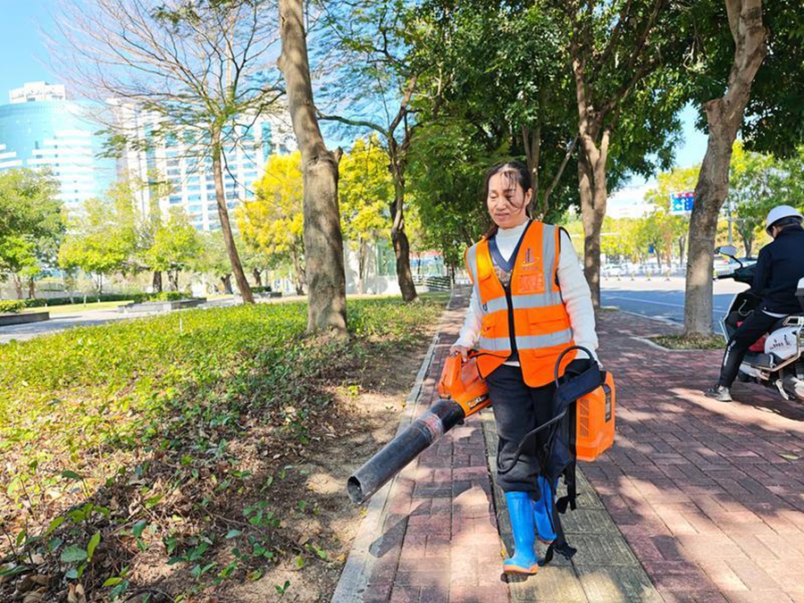 近期開放的惠州市兒童公園成了市民休閑觀光的熱門打卡地,江衛(wèi)艷便是這片區(qū)域的環(huán)衛(wèi)“守護(hù)者”。寒來暑往,片區(qū)的每一條街巷、每一處角落,都留下了她奔波的足跡。她負(fù)責(zé)的片區(qū)生活垃圾量較少,但因綠植繁茂導(dǎo)致落葉繁多。為了保持環(huán)境整潔,清晨的微光尚未灑滿街巷,她和同事們的身影便已出現(xiàn)在街頭。每日清晨的全面清掃是雷打不動(dòng)的工作,機(jī)掃車、灑水車協(xié)同作業(yè),人工則不間斷巡查,哪怕是一片飄散的落葉、一點(diǎn)零星的垃圾,都會(huì)被及時(shí)清理干凈。